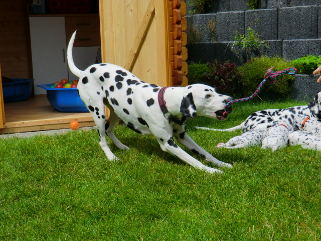 Endlich eine Wetterbesserung, aber Sommer kann man das dieses Jahr wohl nicht so recht nennen. Wenigstens hat der Regen aufgehört und die Welpen sind gestern endlich ins Welpenhaus mit Abenteuerspielplatz umgezogen. So langsam war es nämlich auch nicht mehr möglich die Zwerge im Haus zu halten, sie wollten raus und haben das lautstark verkündet. ;-) Einen Sommerwurf habe ich mir doch etwas anders vorgestellt - aber es kommt eben immer anders als man denkt - so ist es ja oft, und so sucht der wunderschöne weiß/schwarz gefleckte Rüde Aragorn wieder ein neues Zuhause. Die Familie die für ihn ach so großes Interesse hatte, hat sich dann nicht mehr gemeldet - ist dann wohl auch besser so, wer weis wofür es gut ist.