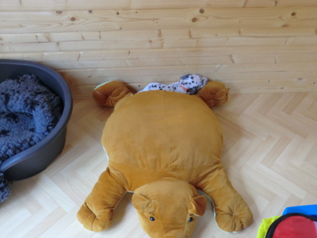 Aragorn hat sich im Welpenhaus hinter dem riesen Teddy schlafen gelegt