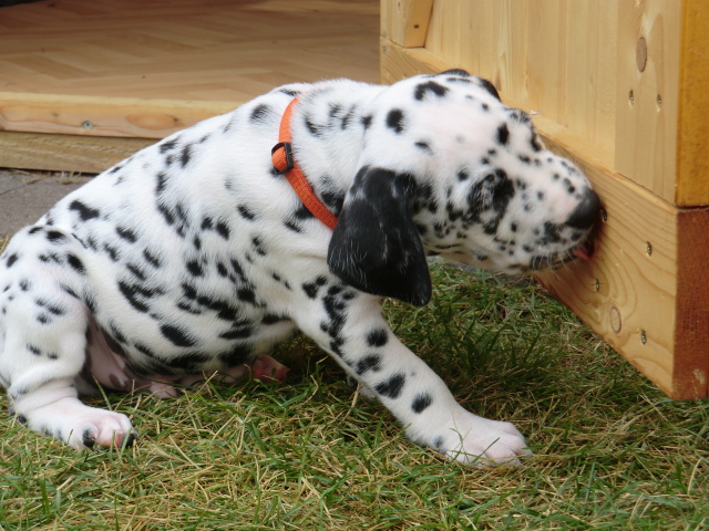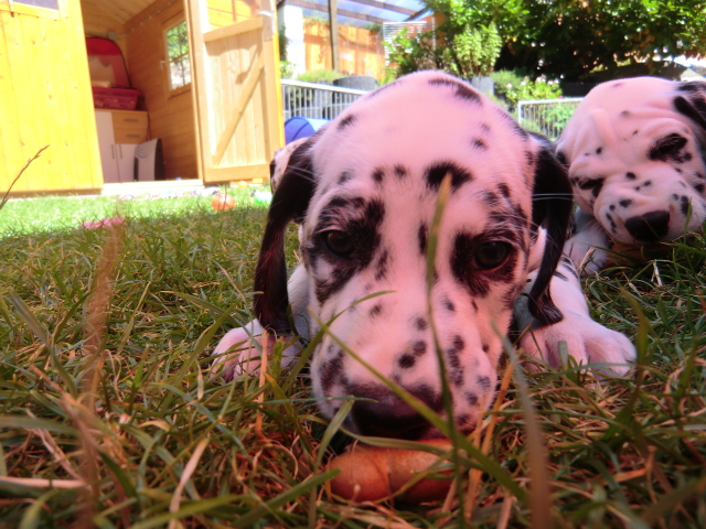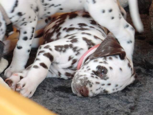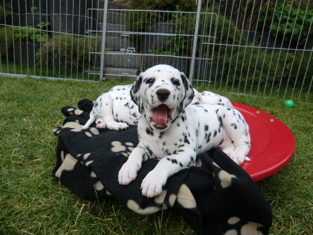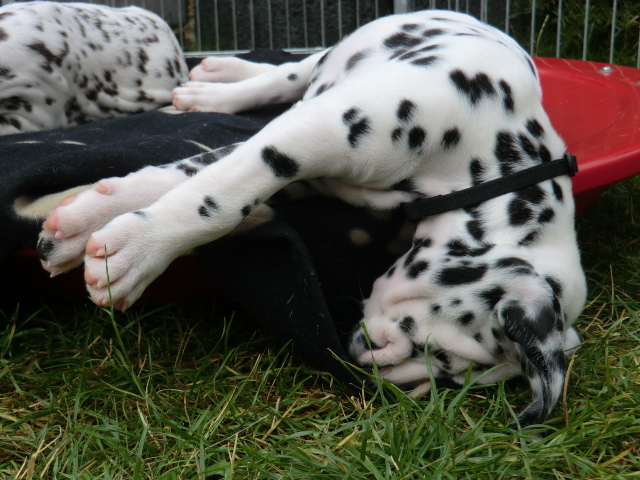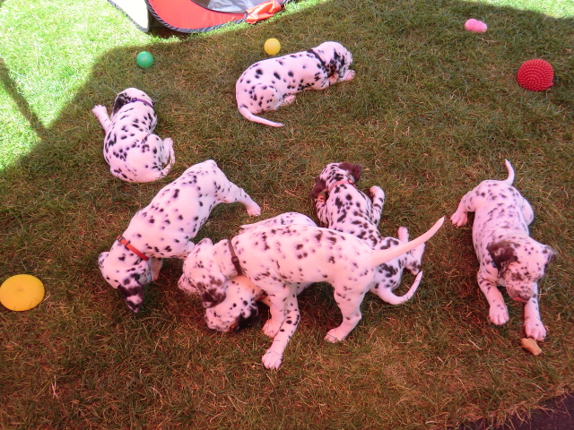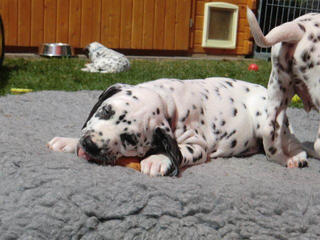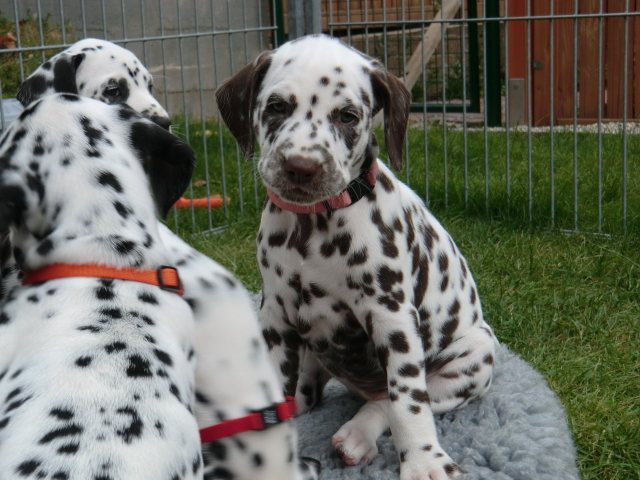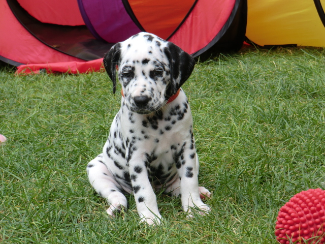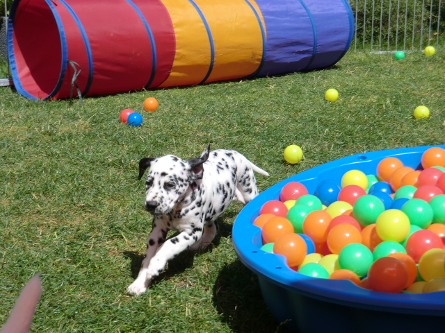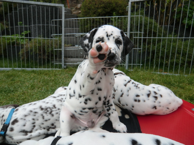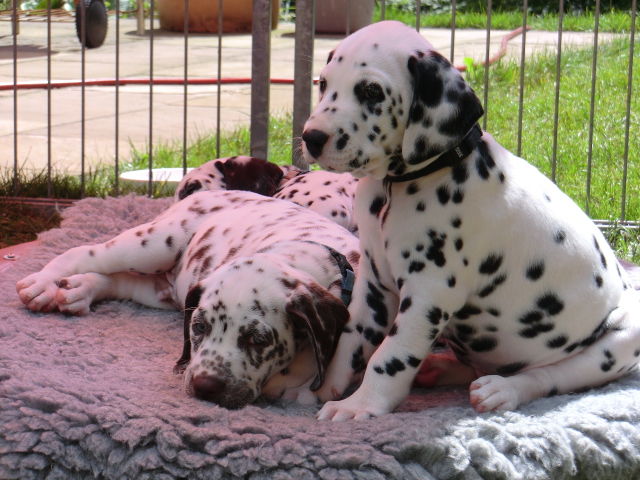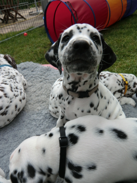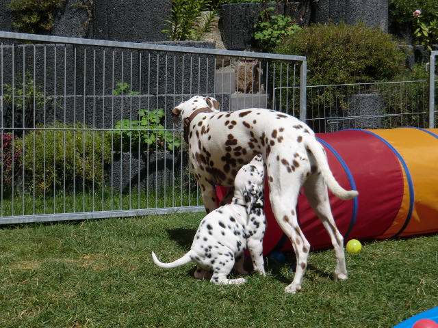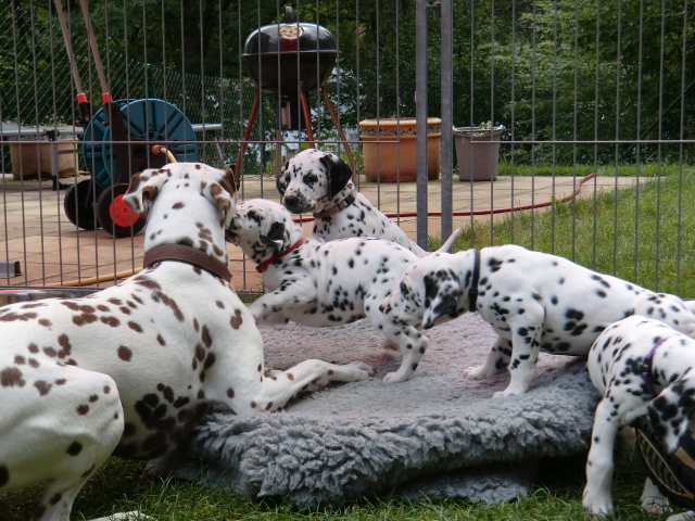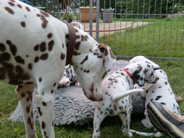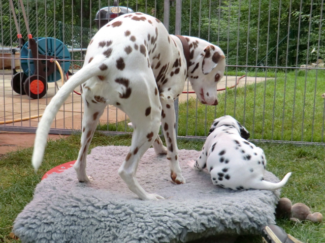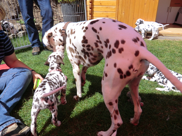 Super schön zu sehen wie frei und ohne irgendeine Scheu unsere A-chen auf fremde Hunde zugehen! Ich finde es sehr wichtig das die Welpen schon beim Züchter andere erwachsene Hunde kennen lernen. Es wurde auch gleich gespielt! Zoe hatte sichtlich spaß mit den vielen kleinen Pünktchen!