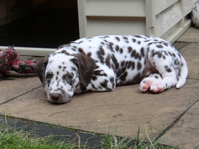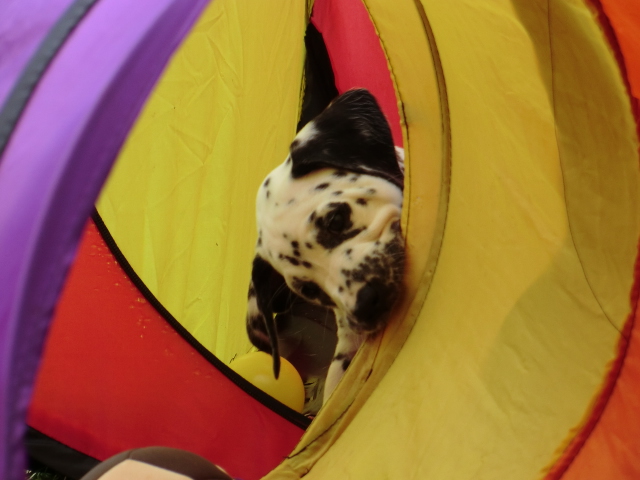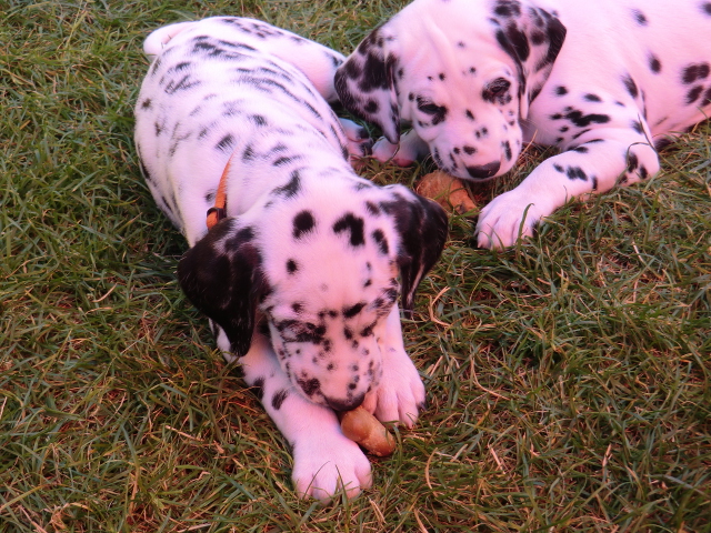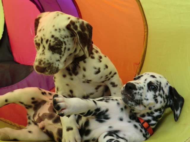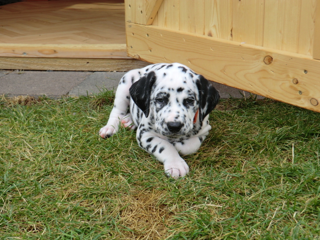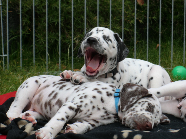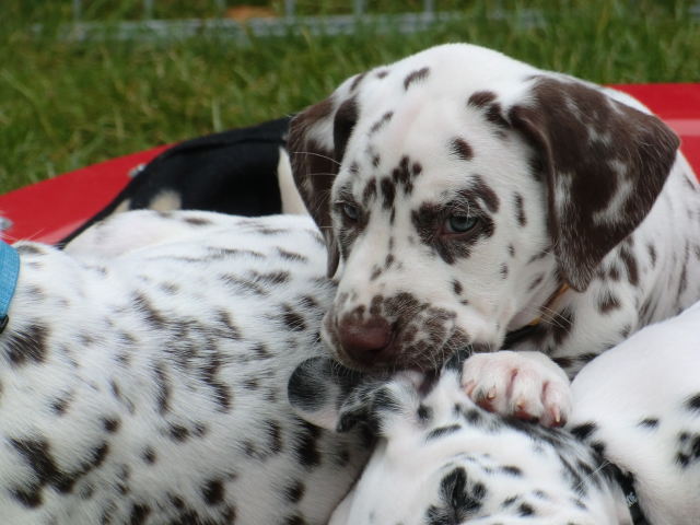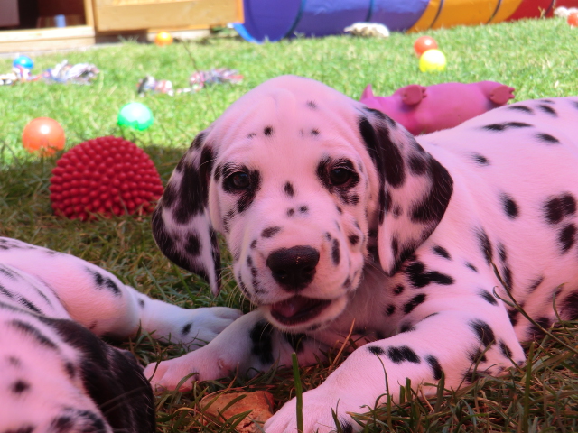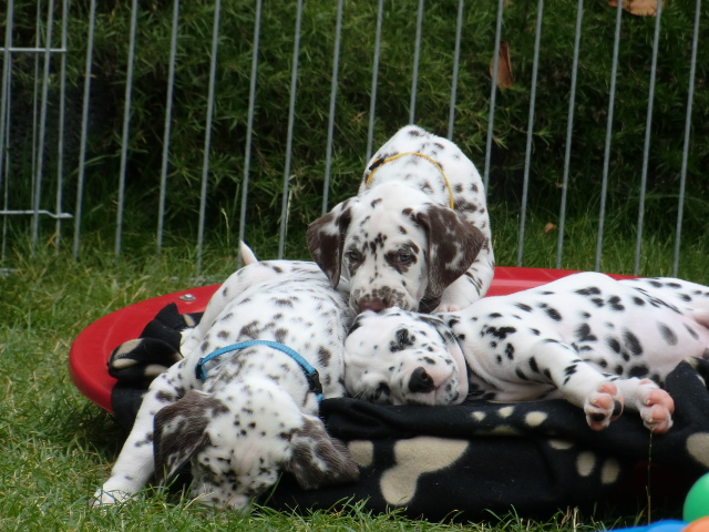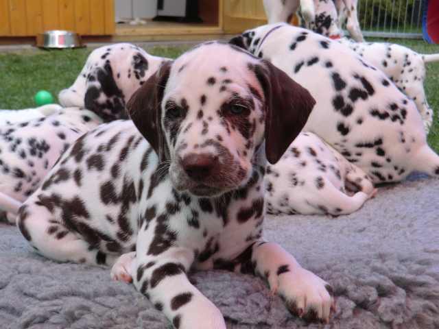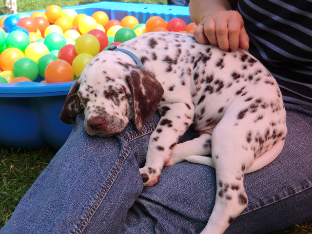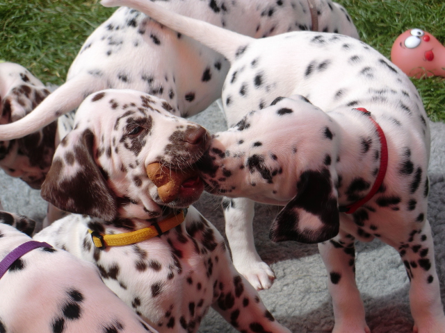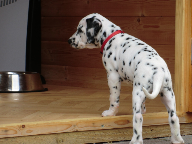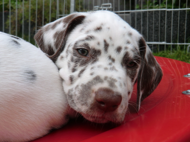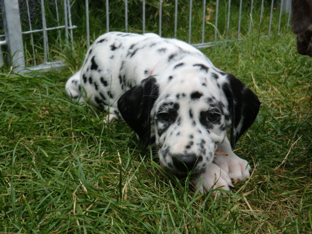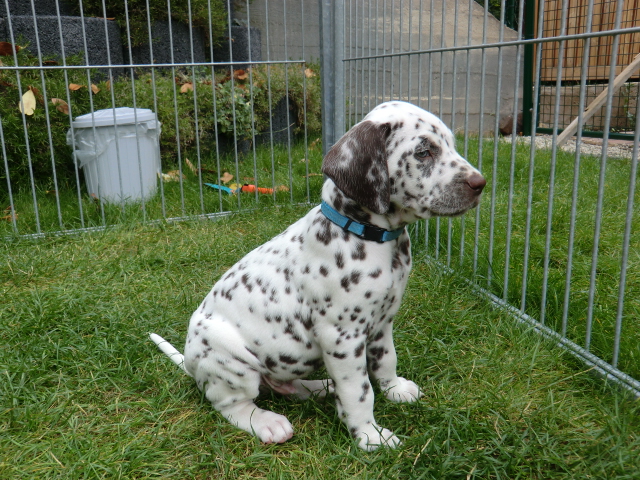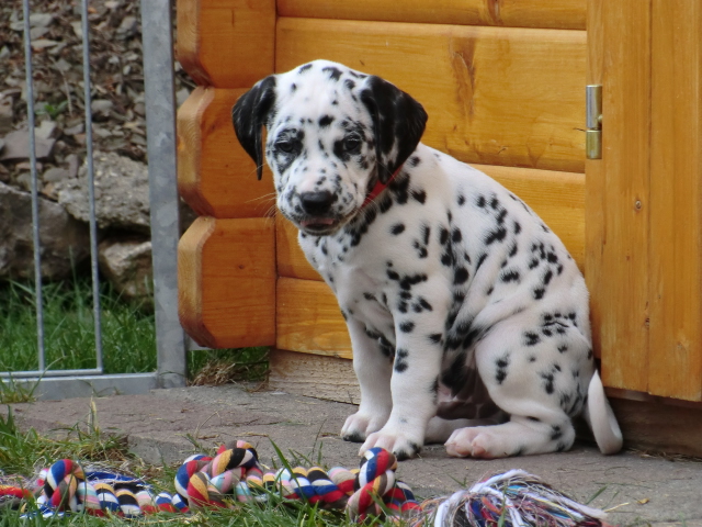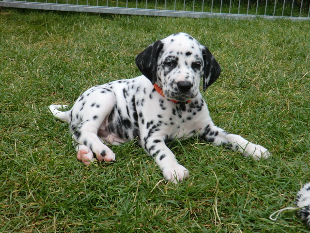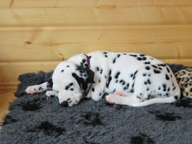Super schön zu sehen wie frei und ohne irgendeine Scheu unsere A-chen auf fremde Hunde zugehen! Ich finde es sehr wichtig das die Welpen schon beim Züchter andere erwachsene Hunde kennen lernen. Es wurde auch gleich gespielt! Zoe hatte sichtlich spaß mit den vielen kleinen Pünktchen!