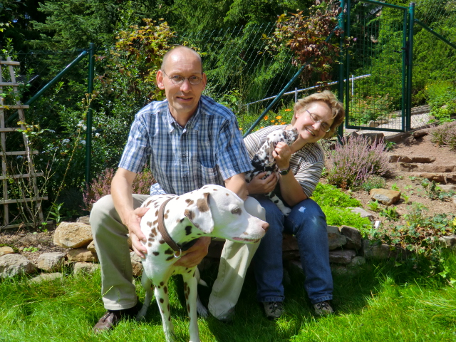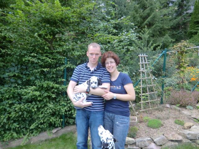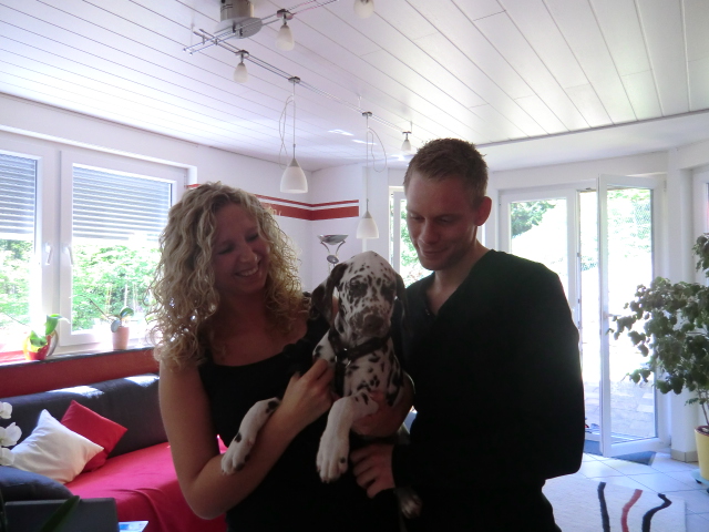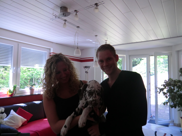 Braune Punkte sollte das neue Familienmitgied haben, das stand schon fest und Monique verliebte sich gleich in die wunderschöne Schokonase Charly anhand der Fotos. Schnell war ein Termin gefunden um Charly zu besuchen. Unser Prinz überzeugte die zwei mit seinem Charme und konnte auch gleich in sein neues Heim Umziehen. Charly wohnt jetzt in der Nähe der Niederländischen Grenze in Wachtendonk. Dort wird er bei Monique & Niko ein schönes Dalmatinergerechtes leben führen! Auch Hundeerfahrung ist mehr als genug vorhanden! Da es doch mein Wunsch ist den hübschen Charly nicht irgendwo "untergehen" zu lassen, sondern auch ab und an mal mit ihm Ausstellungen zu besuchen, haben wir auch in der Hinsicht ein tolles Heim für die Schokonase gefunden und Charly wird auch schon mal mit zu Zuchtshows kommen!