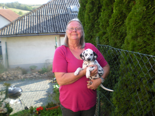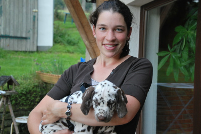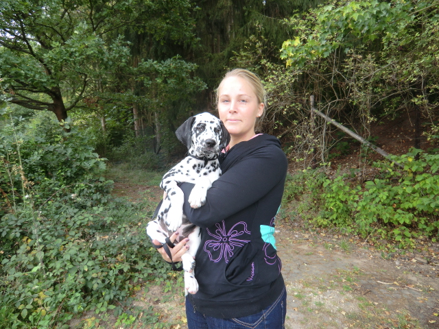 Am 18.08. wurde dann die Schokoprinzessin Abby abgeholt. Erstmals trafen wir uns im Mai auf der Ausstellung in Dortmund! Der "Wunschdalmi" war eine Lady in weiß/braun! Alina gab sich alle Mühe und tatsächlich wurde auch eine weiß/braun geflecktes Mädel geboren! Wie das weiße Mäuschen einmal aussehen würde wuste ja niemand! Doch es war Liebe auf den ersten Punkt und davon hat Abby viele! Sie wird bei Christiane und John Strümer & Dalmidame Zoe in Altenstadt wohnen. Abby soll mal Therapie- und Vorführhund bei Massagekursen werden, sowie Frauchen beim Reiten + Fahrradfahren und Herrchen beim Joggen begleiten!