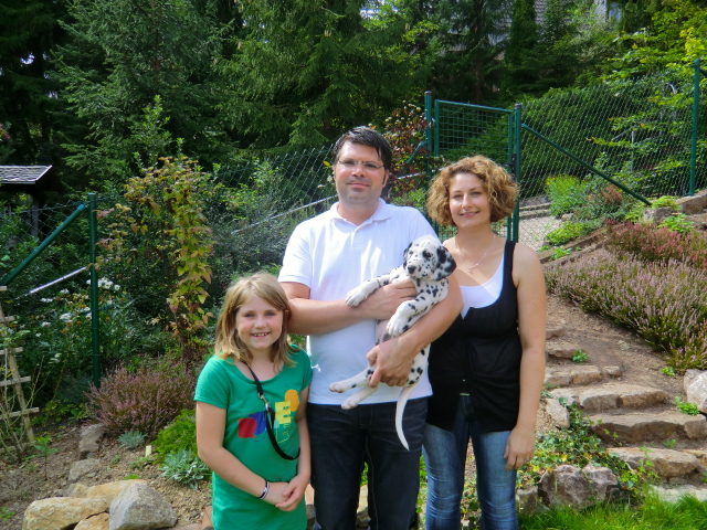 Aragorn-Quincy (Rufname Quincy) wurde am 05.09.2011 abgeholt. Er wird bei Familie Dorissen in Bergheim wohnen und bleibt so ganz in der Nähe! Eigentlich sollte es ein Welpe von Elena werden, da sie sich für ein A-chen etwas spät gemeldet hatten. Als dann der hübsche Aragorn doch noch zu vergeben war, stand für Simone schnell fest die hübsche Lakritznase soll es werden! Er wurde besonders oft besucht und sehnsüchtig erwartet! Zur Familie gehört schon ein Vierbeiner, eine ganz liebe Hündin aus dem Tierschutz mit der Quincy bestimmt schnell Freundschaft schließen wird! Wir wünschen ganz viel Spaß mit dem hübschen Punktemann!