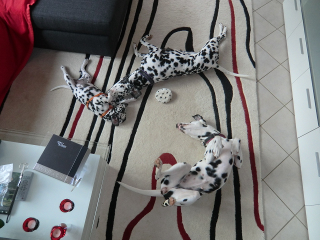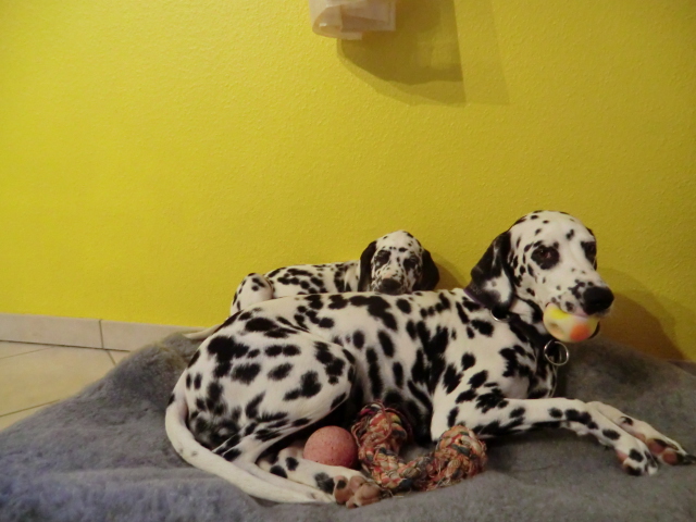 Es macht einen Riesen Spaß mit dem kleinen Quincy und am liebsten würde ich den Schatz gar nicht mehr hergeben. Er ist einfach so lieb und hat ganz genau den gleichen Blick wie meine Alina! Auch ist er unheimlich Pflegeleicht und Hund Nummer 3 fällt überhaupt nicht auf! Er war vom 1. Tag an stubenrein, meldet sich immer brav an Haustür oder Terrassentür wenn er raus muss, ist unheimlich verspielt, ein ganz großer Schmuser und sehr schlau! Dann hat er scheinbar Angst vor nichts. Selbst der Mann heute morgen mit den Nordic Walking Stöcken konnte Quincy keine Angst machen - mit Alina & Elena hat er ja auch spitzen Vorbilder. Alle 2- und 4-Beiner werden freudig begrüßt. Auch meine Möbel haben bisher keinen Schaden genommen - bis auf meine Fliegenklatsche und einige Blätter von meinen Pflanzen gab es keine nennenswerten Schäden.