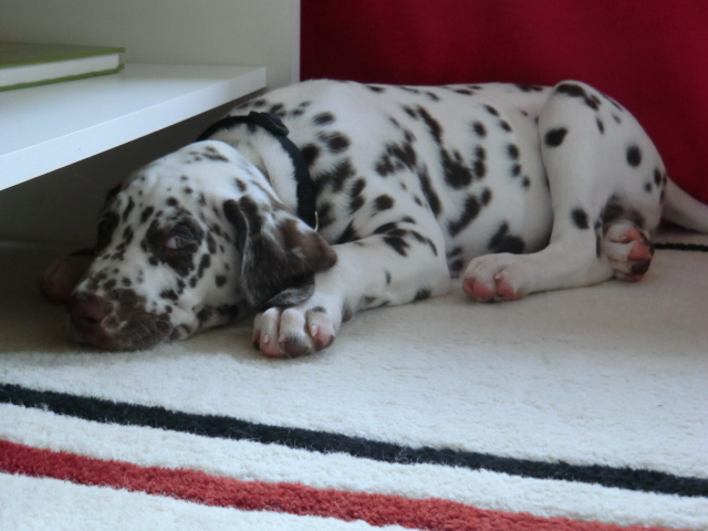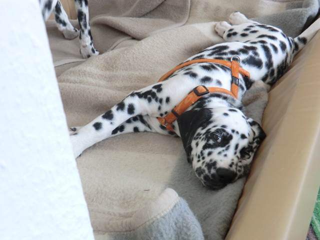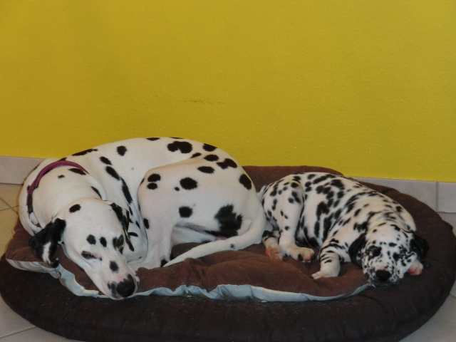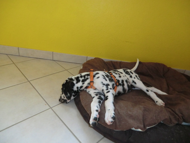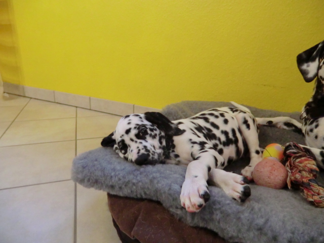 Seit Montag kommt Quincy mit zur Arbeit und was soll ich sagen: ein Traum, er schläft brav mit Alina & Elena im Körbchen, ist total ruhig. Kein Weinen, Jammern oder Quatsch machen! Keiner meiner Mädels war als Welpe so unglaublich unkompliziert!