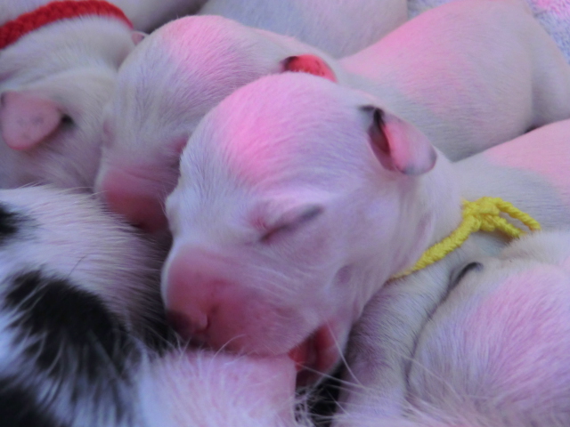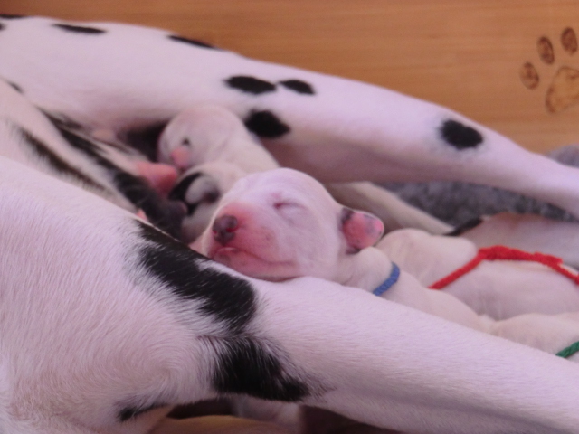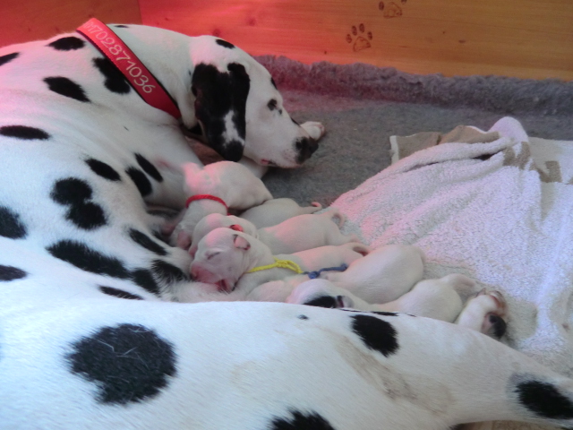 Nach Nummer 9 um punkt 12 Uhr, unserem Fräulein Grün mit der hübschen Doppelplatte machte Elena eine längere Pause, und lies ihre Welpen ausgiebig trinken. Vorher war das immer nur mal ganz kurz möglich und teilweise mussten gerade geborene Welpen auf den ersten Schluck Milch warten, weil schon das nächste Geschwisterchen im Anmarsch war.