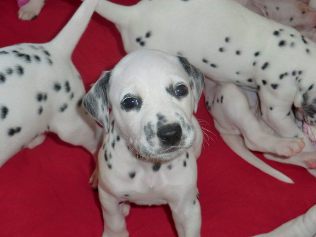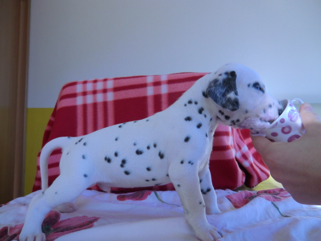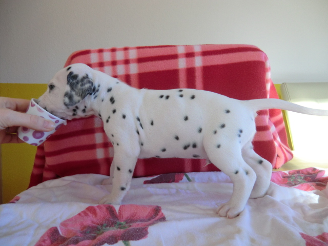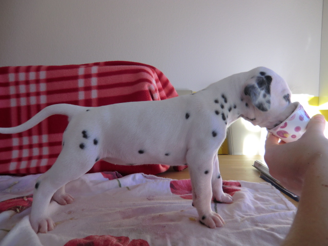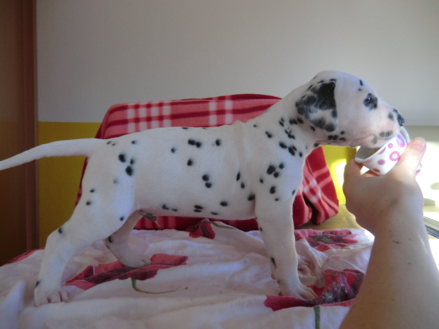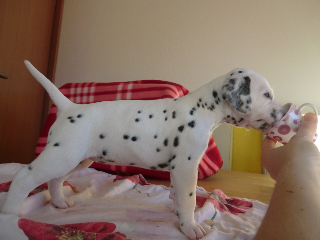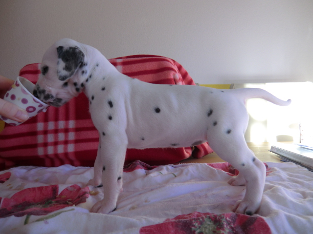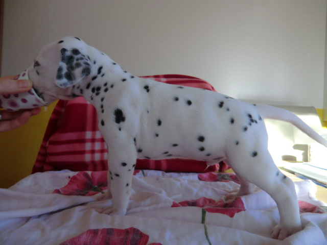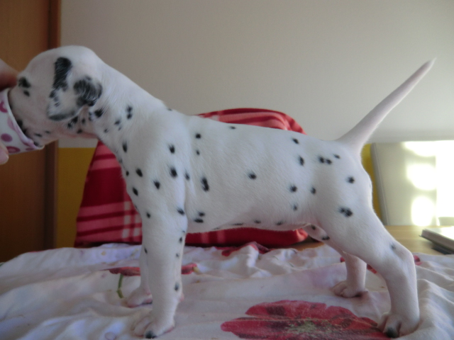 Bella ist eine harmonisch aufgebaute, sehr schöne und Elegante Hündin. Sie hat eine sehr schöne Tüpfelung & sattes kräftiges Pigment, dunkelbraune, fast schwarze Augen, sehr schön hell gefleckte Ohren. Sie besitzt ein sehr aufgeschlossenes, verspieltes und anhängliches Wesen mit angenehmen Temperament.