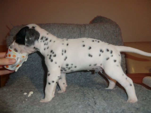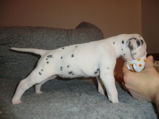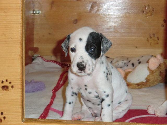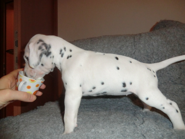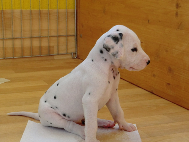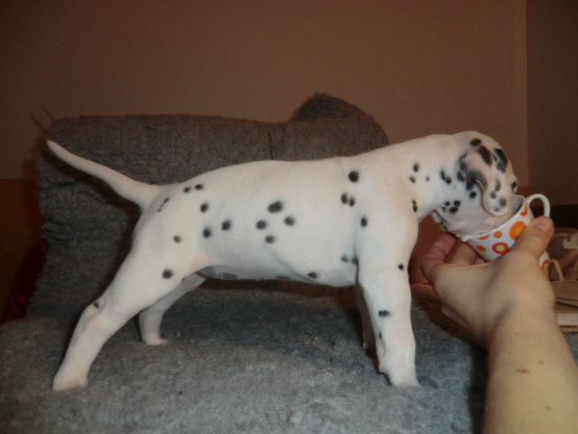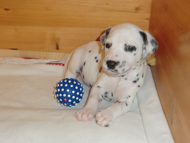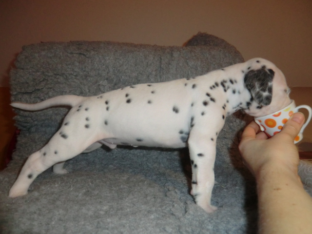 Ein etwas kräftigerer Rüde mit schöner gleichmäßiger Tüpfelung, kräftigen Knochen, einem schönen Typischen Rüdenkopf, kräftigen Pigment und dunkelbraunen Augen. Er ist ein ganz lieber, verspielter und anhänglicher junger Mann! Ob er mal in die Pfotenabdrücke seines erfolgreichen Papas treten wird?!