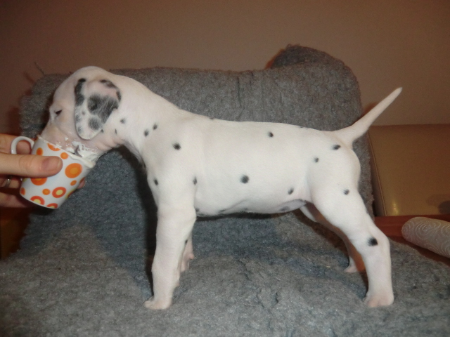 Als kleinster Rüde geboren, hat sich Balisto zu einem wunderschönen mittelkräftigen Rüde entwickelt, mit vorzüglicher Tüpfelung & Pigment, kräftigem Knochenbau und dunkelbraunen Augen. Der kleine Prinz besitzt ein sehr liebes, aufgewecktes und aufgeschlossenes Wesen.