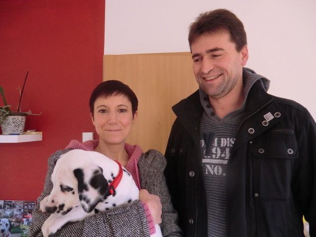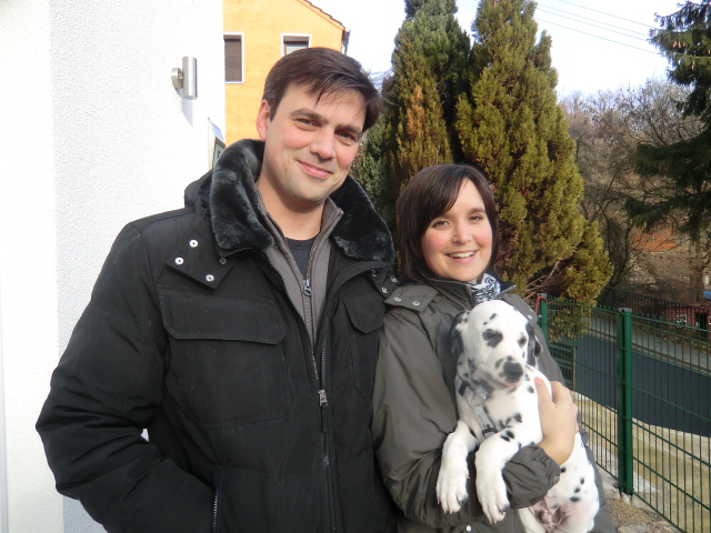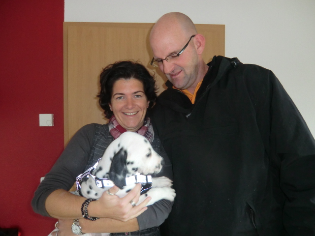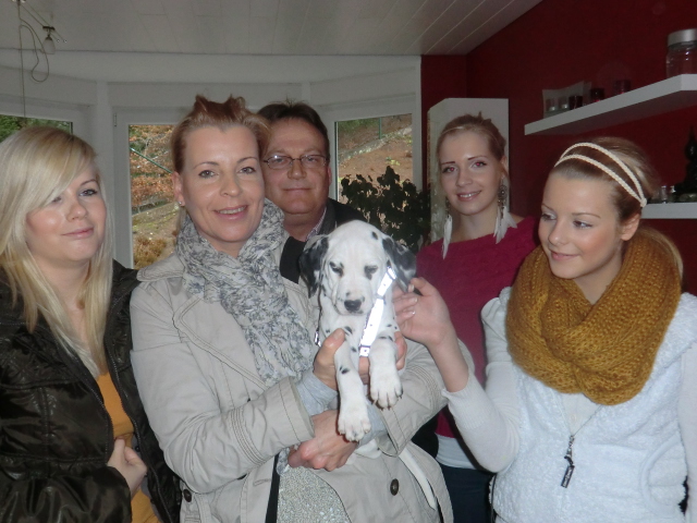 Unsere kleine Bella wird als einzigste sehr weit wegziehen – doch auch sie werden wir ganz sicher wieder sehen! Schon im Oktober 2010 hatten wir den ersten Mail Kontakt mit Alexandra und Hans aus Bayern, und haben uns dann im März 2011 in München auf der IRA getroffen. Da konnten sie sogar auch schon den Papa Balou kennen lernen, und waren ganz angetan von dem Traumpaar. Am 11.11., dem beginn der 5. Jahreszeit, haben sie uns das erste Mal in Bad Münstereifel besucht. Bella eroberte das Herz der beiden im Sturm und es so war klar das sie gemeinsam mit Dalmatinerhündin Tini in Sauerlach bei München leben soll! Bestimmt wird man die kleine Schönheit - die Ihrer hübschen Mama Elena so ähnlich ist - auch mal auf einer Ausstellung bewundern können :-)