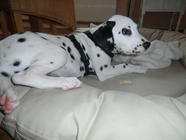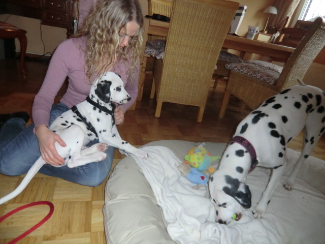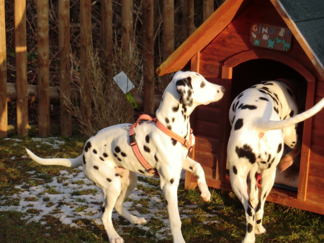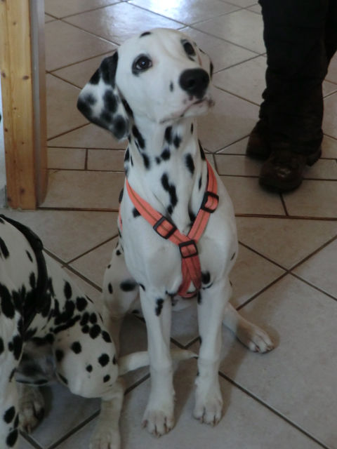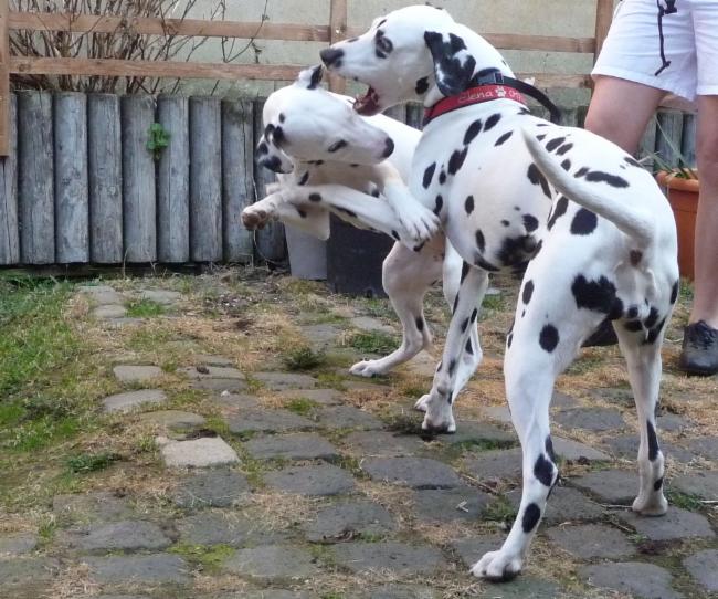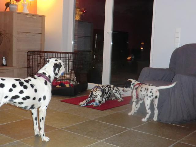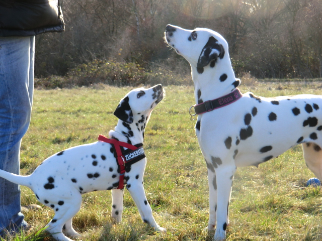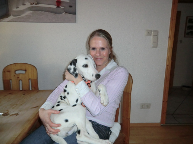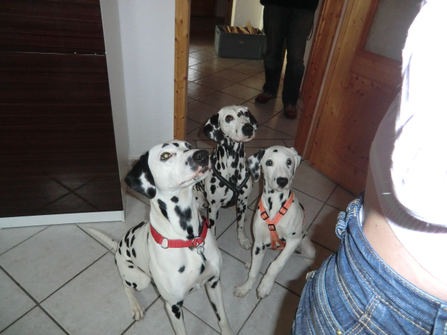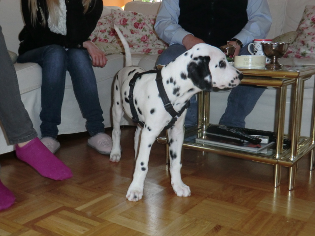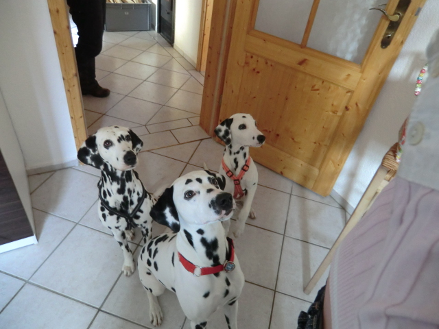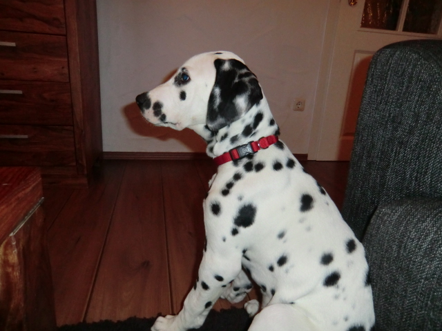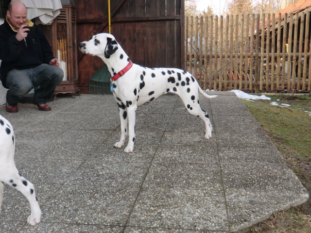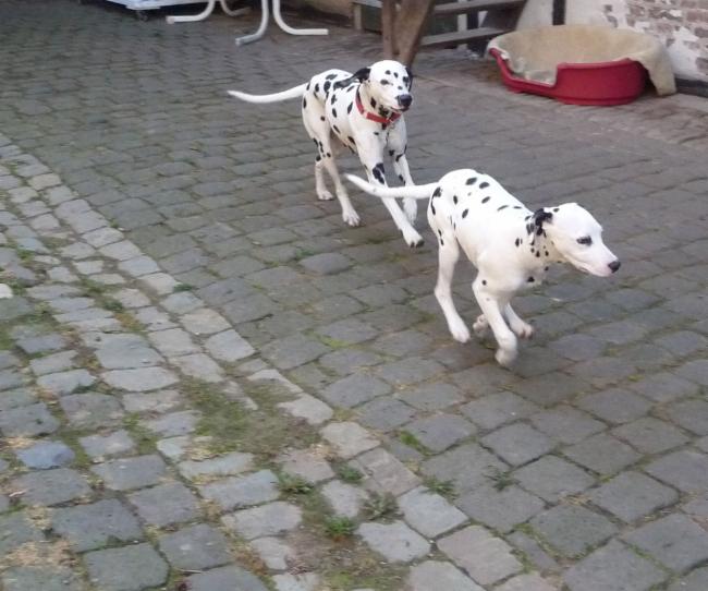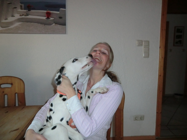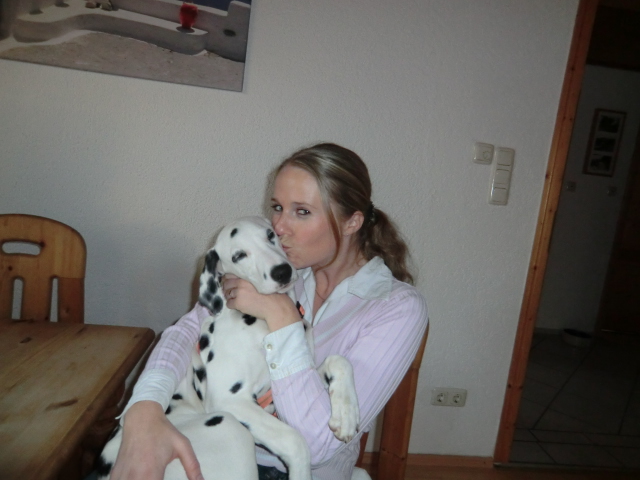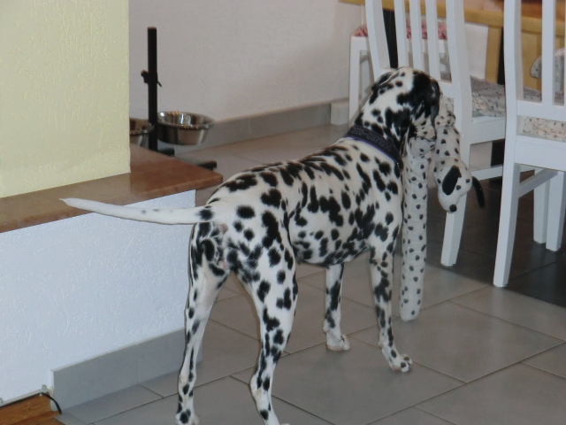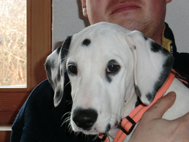 Wir haben Balou Junior auf dem Rückweg von Waldems in seinem neuen Heim in Mayen besucht! Balou ist schon ordendlich gewachsen und ein ganz lieber, aufgeweckter und sehr hübscher Punktemann. In der Hundeschule wo Herrchen und Frauchen vollkommen unvorbereitet hingegangen sind, zeigte er sich als kleiner Streber :-) Auch sonstige Komandos waren sehr schnell verstanden - ein ganz schlaues Kerlchen, wie die Mama Elena & der Papa Balou!