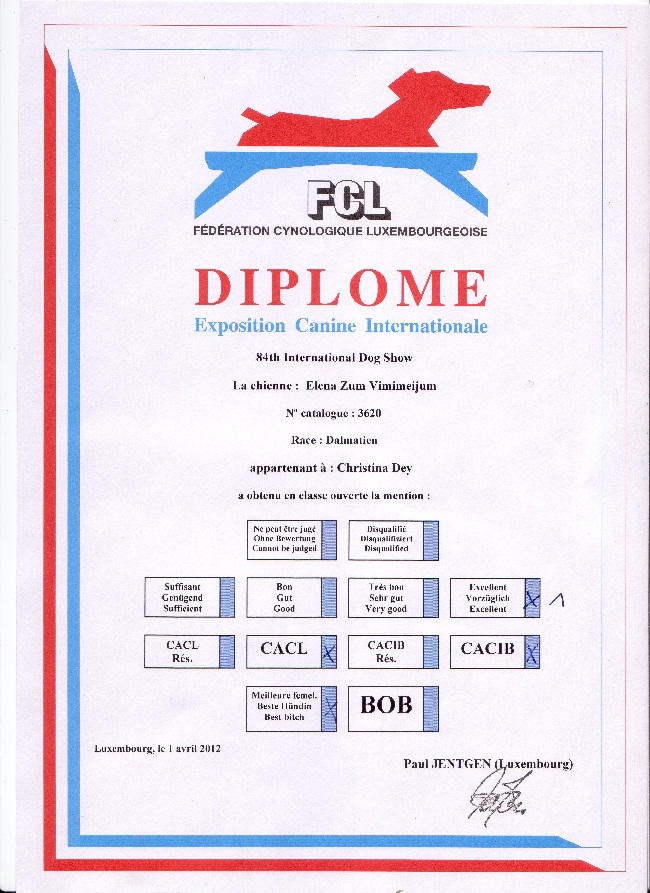 12.06.2011 Internationale Luxemburg __________________________________________ Elena zum Vimimeijum - Offene Klasse Richter: Paul Jentgen Formwertnote: Vorzüglich 1; CACL; CACIB, Beste Hündin |