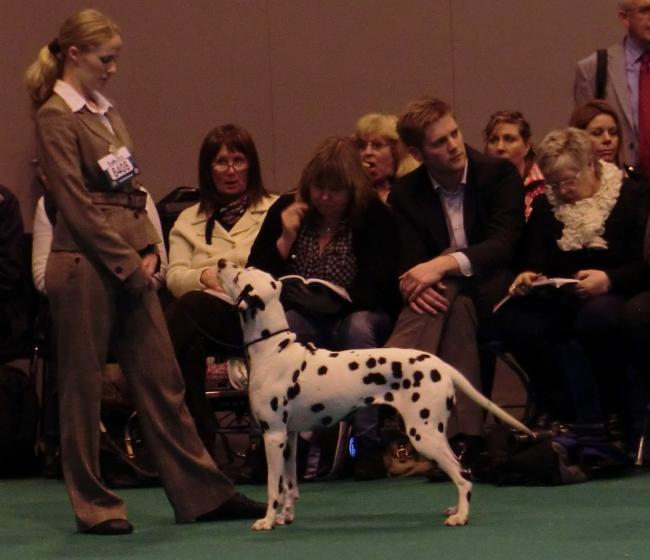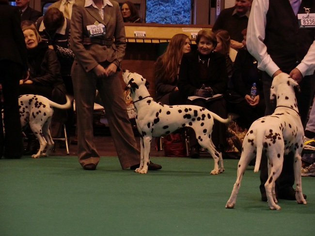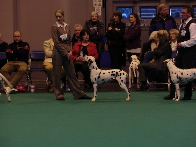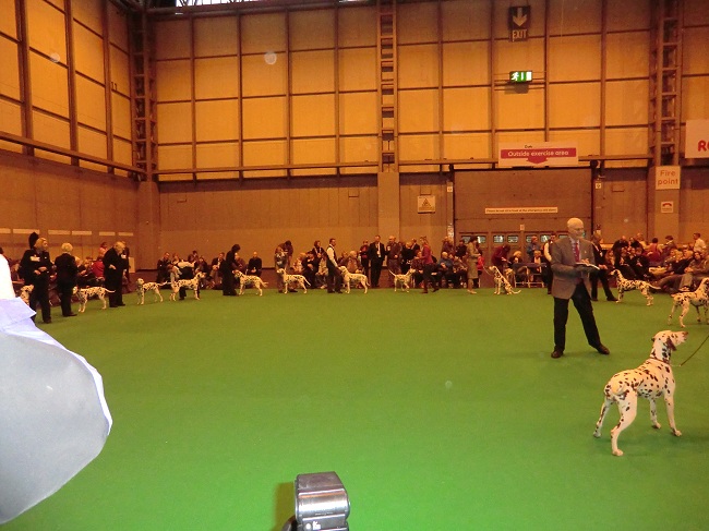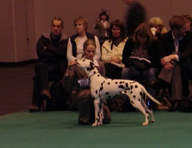 Die Startnummern waren direkt an den Bench hinterlegt, so hätten wir ruhig noch lange schlafen können, da wir noch sehr laaaaannnge warten mussten bis wir dran waren. Die Ringe waren sehr großzügig, aber bei einer durchschnittlichen Meldezahl von 15 Dalmatinern in den Klassen wieder klein. Ein Blick in den Katalog zeigt was uns erwarten sollte. Open Class Hündinnen – (wie bei uns die Championklasse) 19 Meldungen. Die meisten Namen der Hunde waren mehr Nix-sagend, aber bekannte Hunde aus Belgien, Dänemark und Schweden waren auch unter der Konkurrenz zu finden.