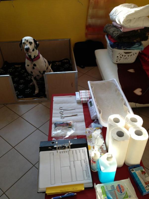 Langsam wird es ernst :-) Wir haben für die Geburt der C-chen alles vorbereitet und vom Bindfaden, über stapelweise gekochtes Bettzeug, erste Halsbänder, vorbereitete Welpenblätter, Waage, etc. steht alles bereit. Noch ist Elena aber die Ruhe selbst, und läuft auch noch gerne. Wir werden berichten :-)