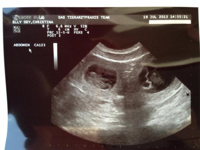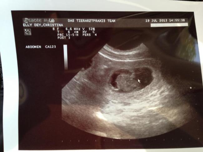 Do, 18.07.2013 bis Mo, 22.07.2013 | Dies ist der beste Zeitpunkt, um die Trächtigkeit anhand des Herzschlags zu diagnostizieren. Die Embroynen sind etwas walnussgroß und sind gleichmäßig im Uterus verteilt. |