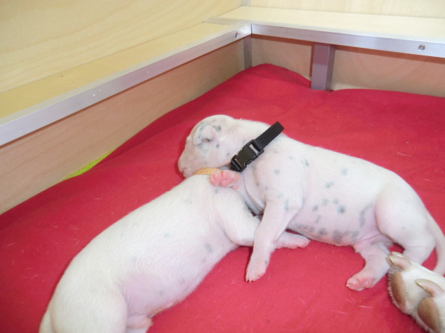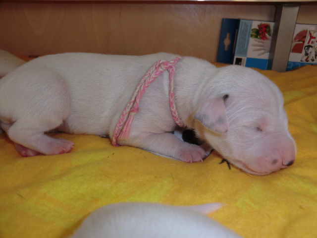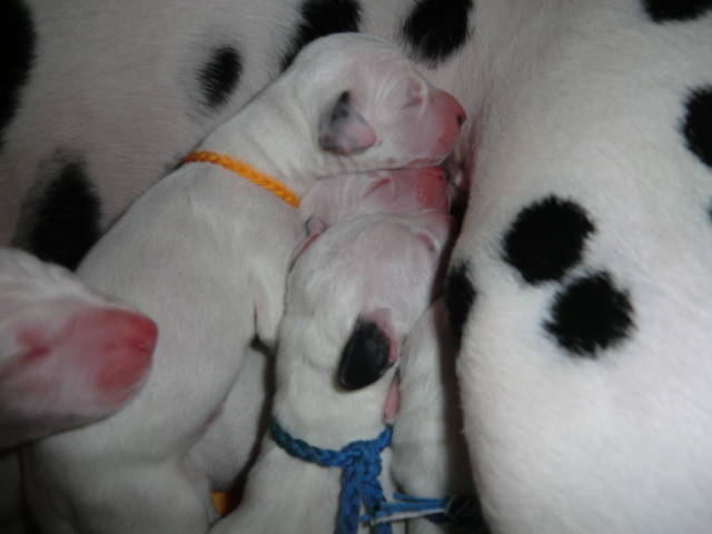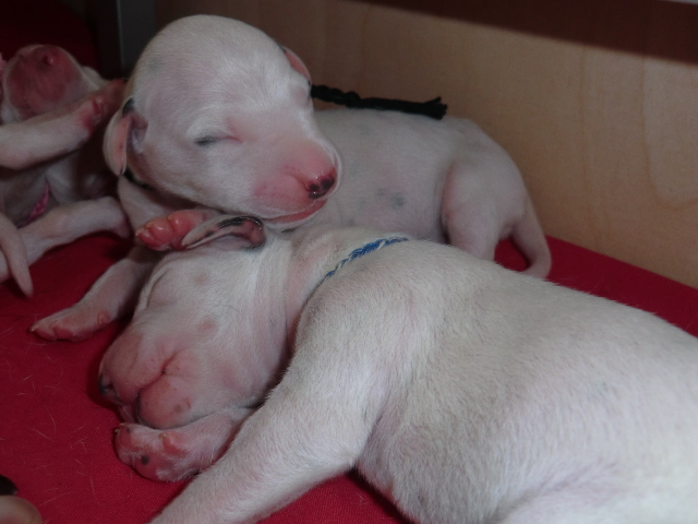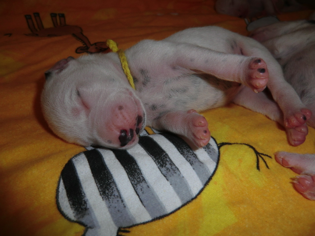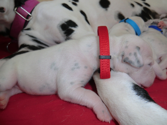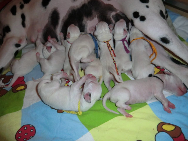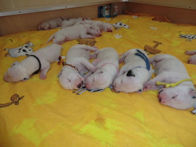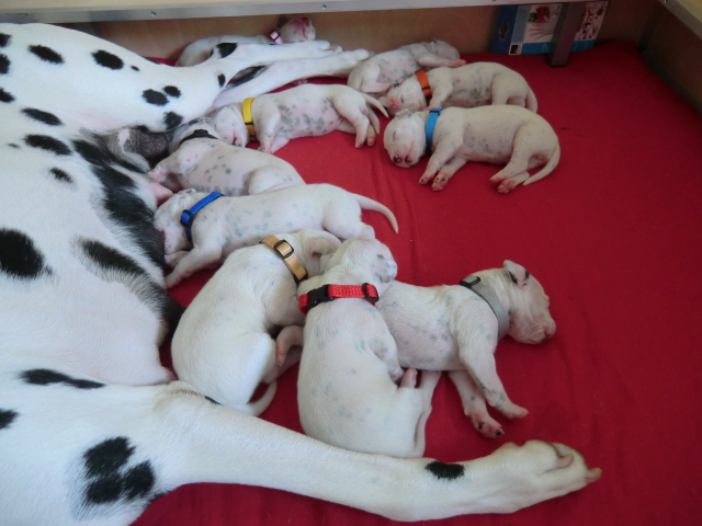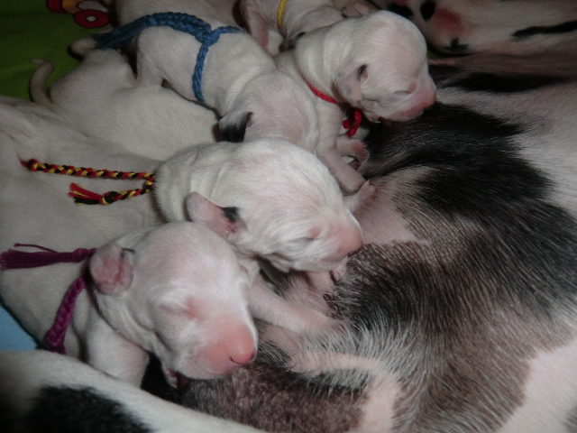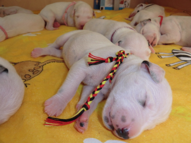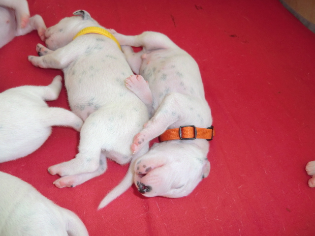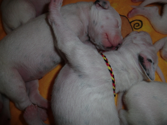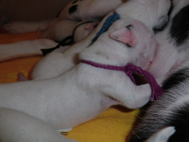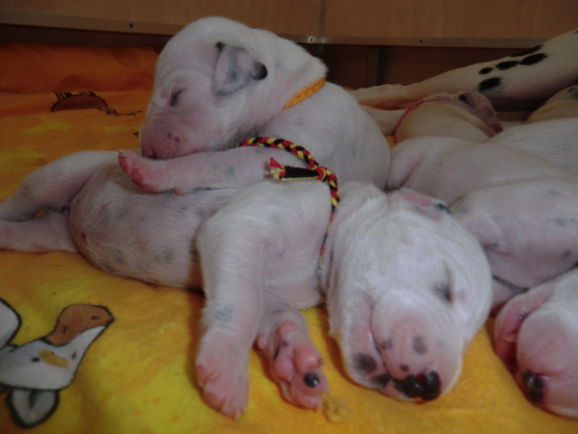 Die Nullpunkte bekommen langsam "Farbe" und die Pünktchen lassen sich schon ganz gut erkennen! Gestern wurde den Zwergen auch ein neuer Halsschmuck angelegt, damit man die Welpen auf Bildern besser unterscheiden kann! :-)