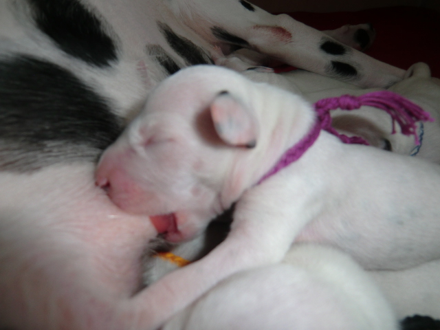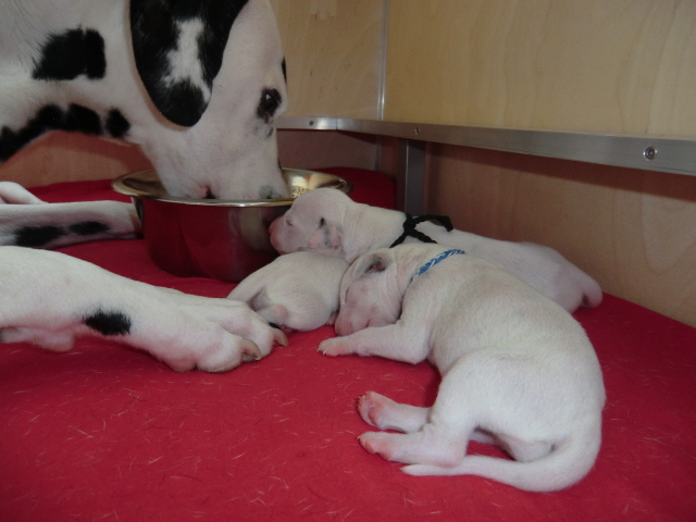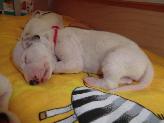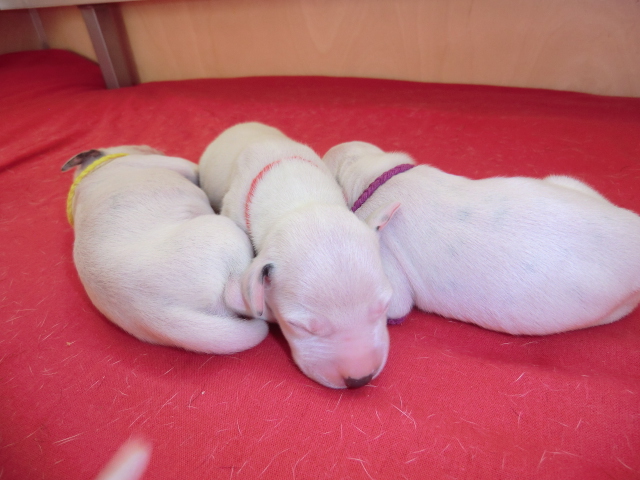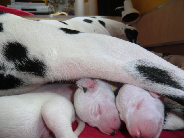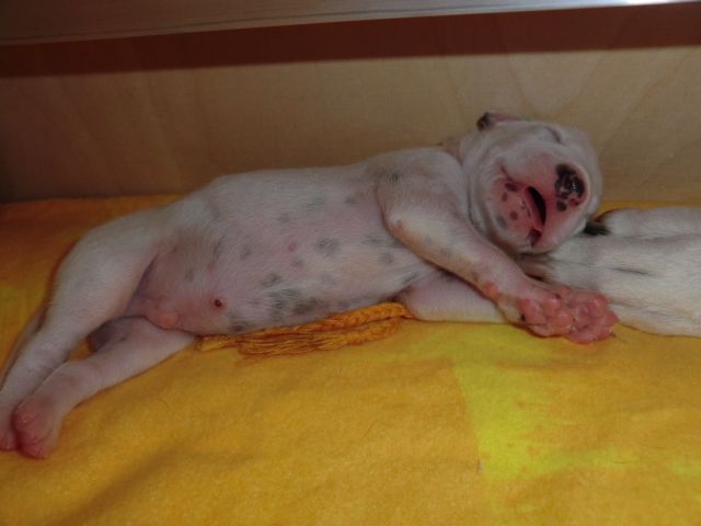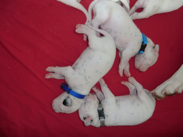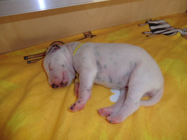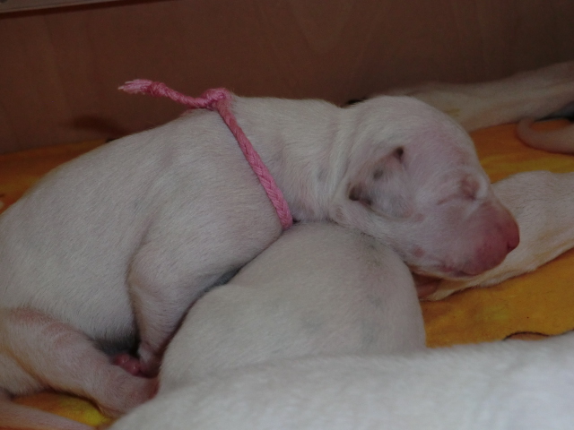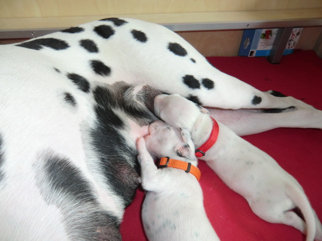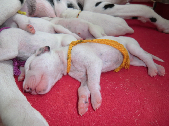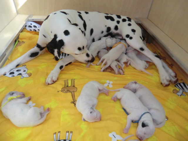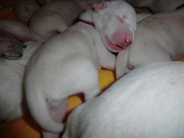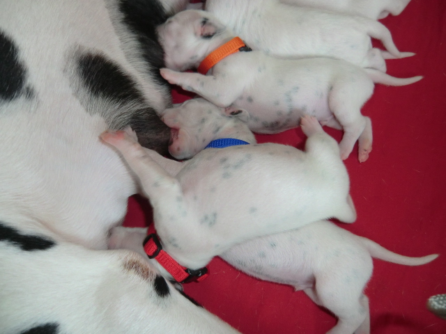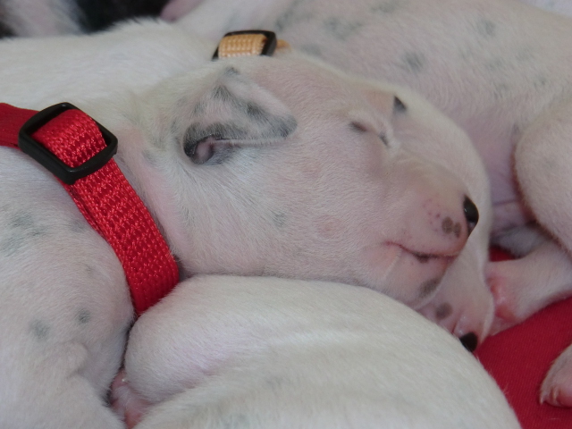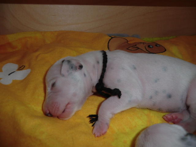 Die Nullpunkte bekommen langsam "Farbe" und die Pünktchen lassen sich schon ganz gut erkennen! Gestern wurde den Zwergen auch ein neuer Halsschmuck angelegt, damit man die Welpen auf Bildern besser unterscheiden kann! :-)