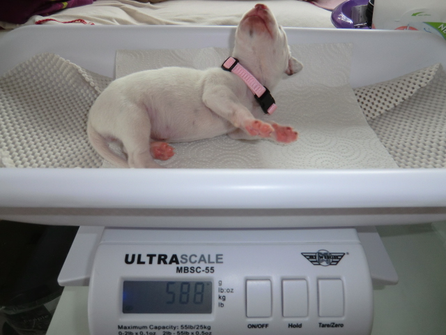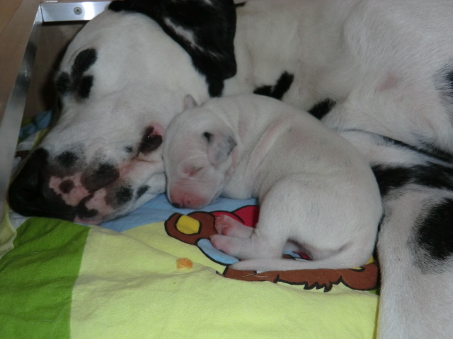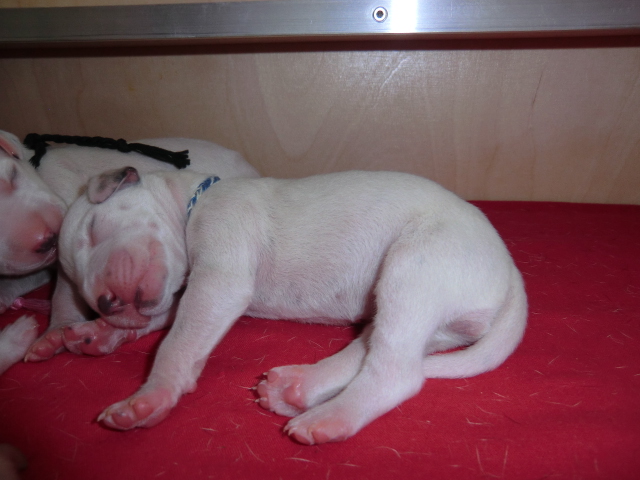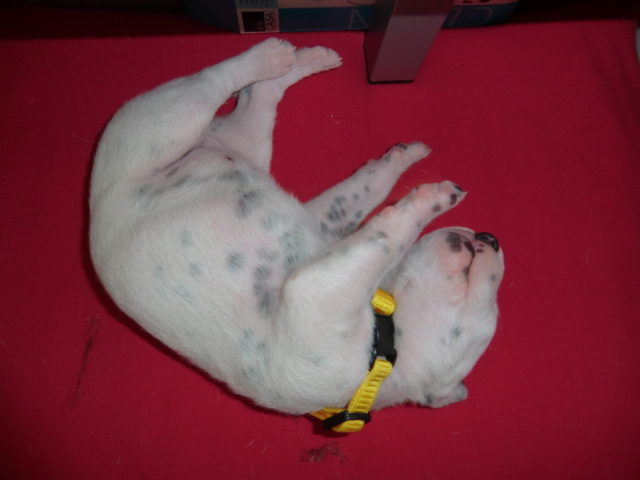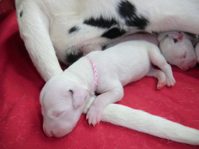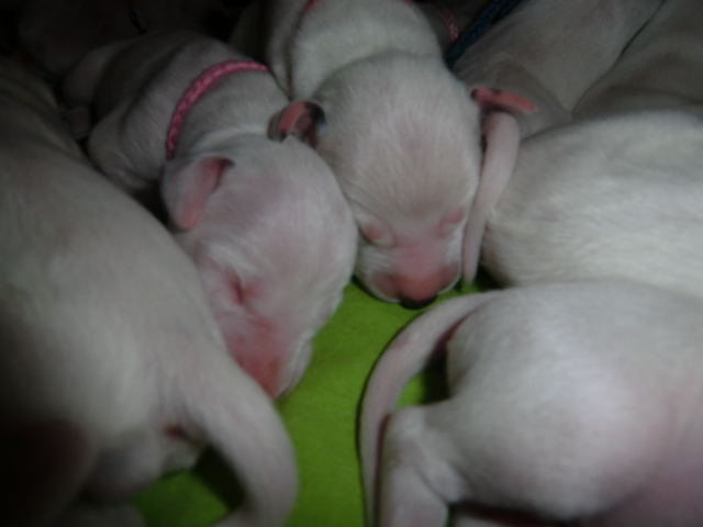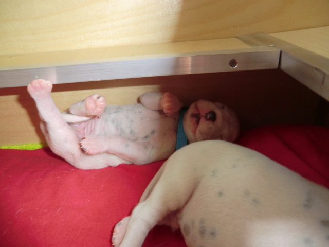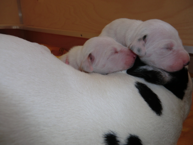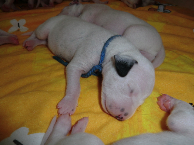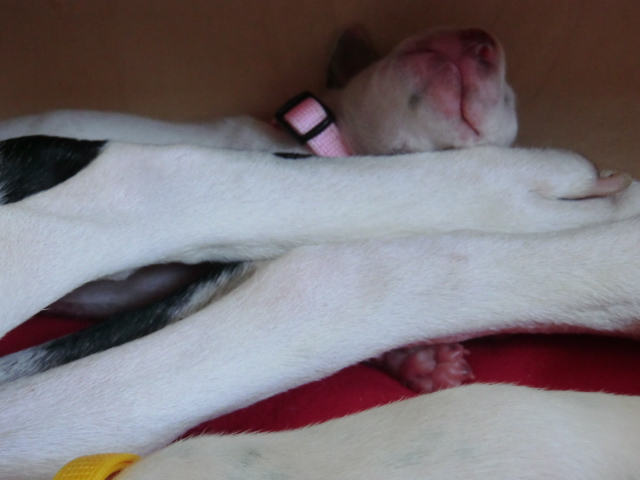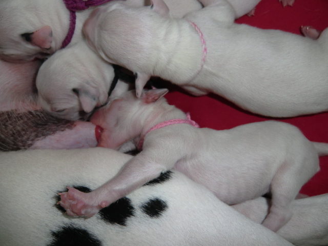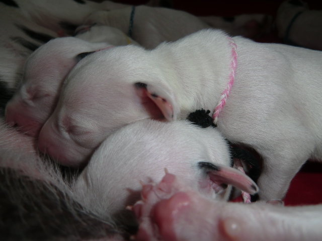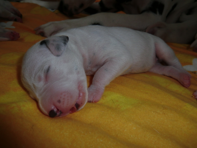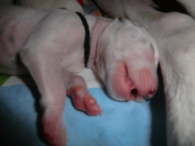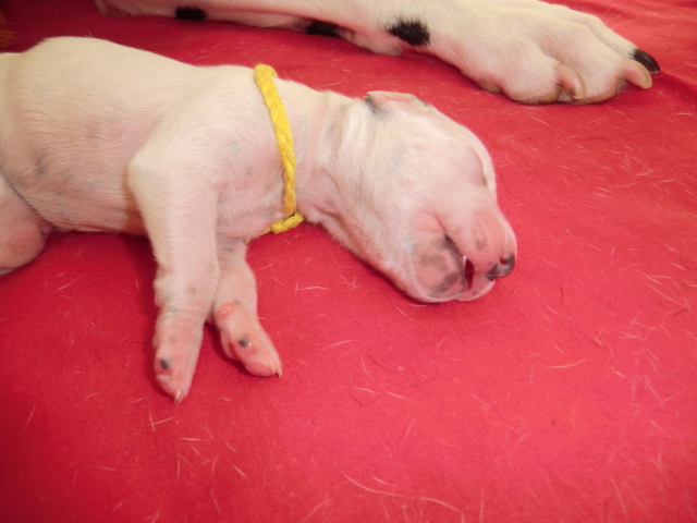Die Nullpunkte bekommen langsam "Farbe" und die Pünktchen lassen sich schon ganz gut erkennen! Gestern wurde den Zwergen auch ein neuer Halsschmuck angelegt, damit man die Welpen auf Bildern besser unterscheiden kann! :-)