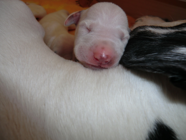 Die ersten beiden Tage sind wie im Flug vergangen! Den Welpen und Mama Elena geht es bestens und die kleinen wachsen und wachsen - man kann ihnen fast dabei zusehen! Unsere super Mami kümmert sich sehr gut um ihren Nachwuchs, und alle haben schon ordentlich an Gewicht zugelegt! Auch unsere zwei kleinsten Frau Lila und Frau Rot haben schon gut aufgeholt! Alina darf nun auch schon den Kopf über den Rand der Wurfkiste strecken, aber am liebsten beobachtet sie das ganze geschehen vom bequemen Couchplatz mit Panoramablick ;-)
