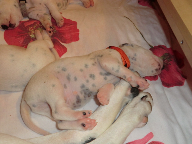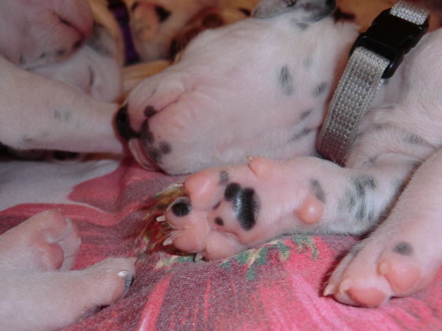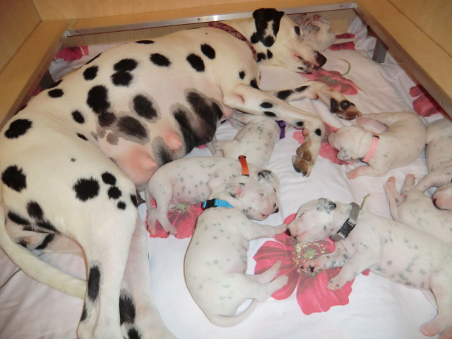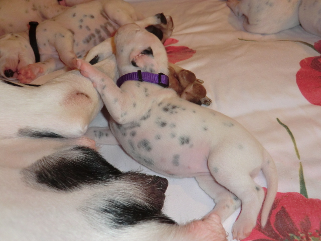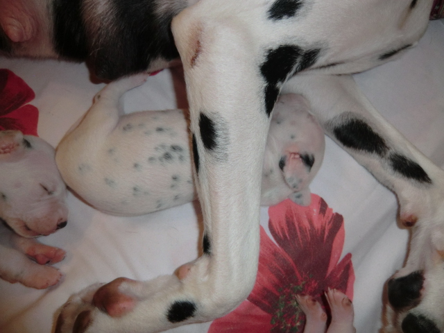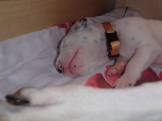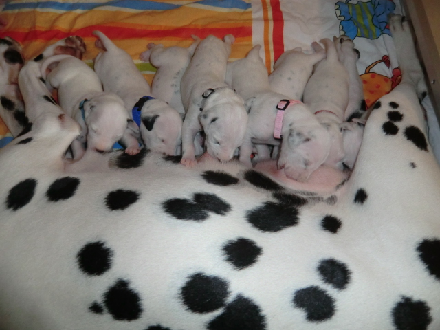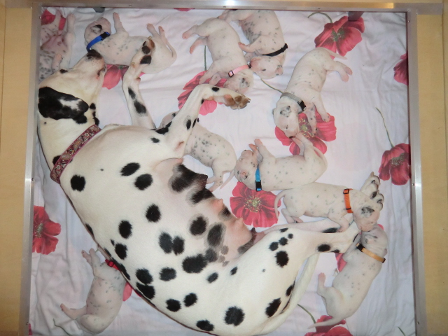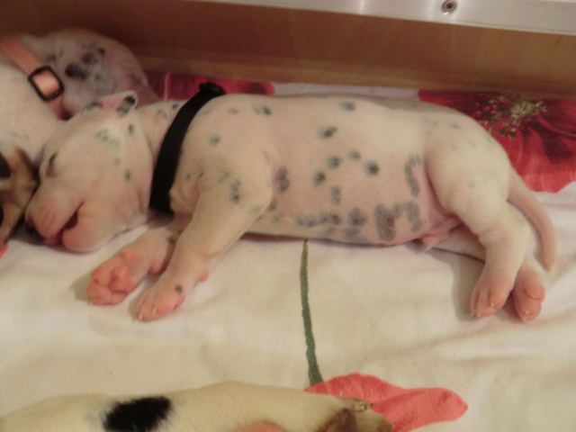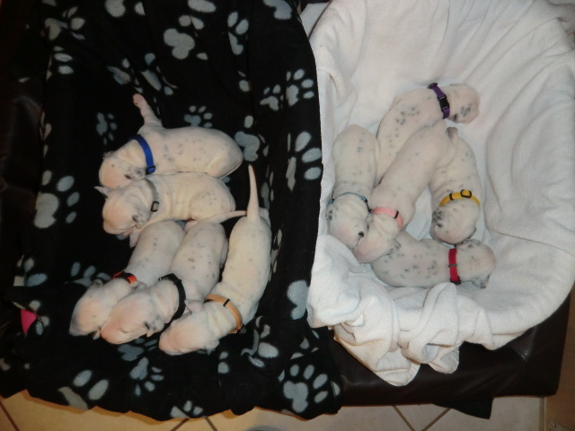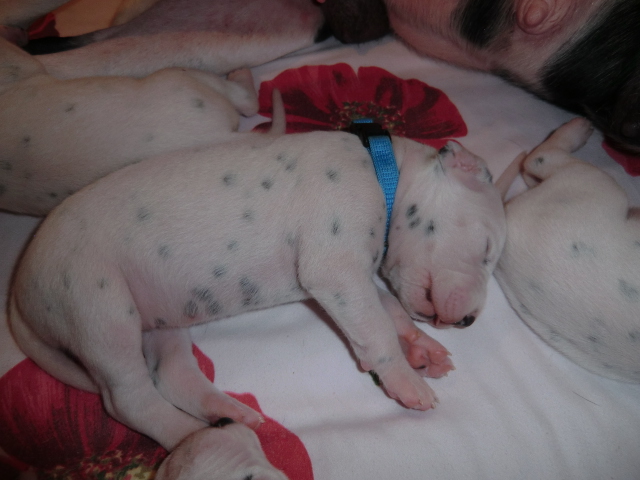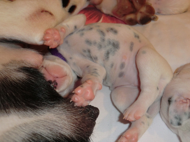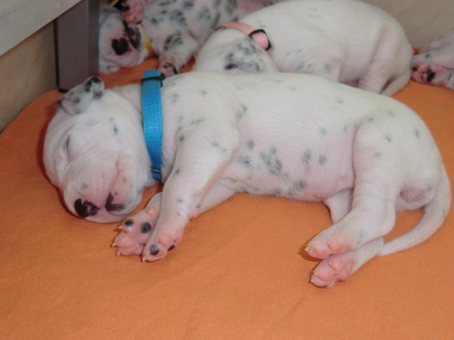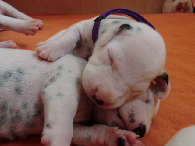 Die 2. Woche ist wohl mit einer der ereignisreichsten! Die Augen öffnen sich bei den Zwergen - unser Herr Blau machte den Anfang am 8. Tag und alle weiteren Geschwister folgten zügig! Wir sind uns ziemlich sicher das alle Welpen braune Augen haben! Die 1. Wurmkur stand auf dem Speiseplan der C-chen....diese wurde mit grimmigen Gesichtsausdruck genommen ;-) was sein muss muss sein...