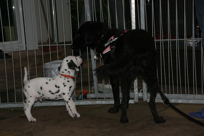 Neugierig und ohne Scheu gehen die C-chen auf die unbekannten vierbeinigen Besucher im Welpengehege zu!