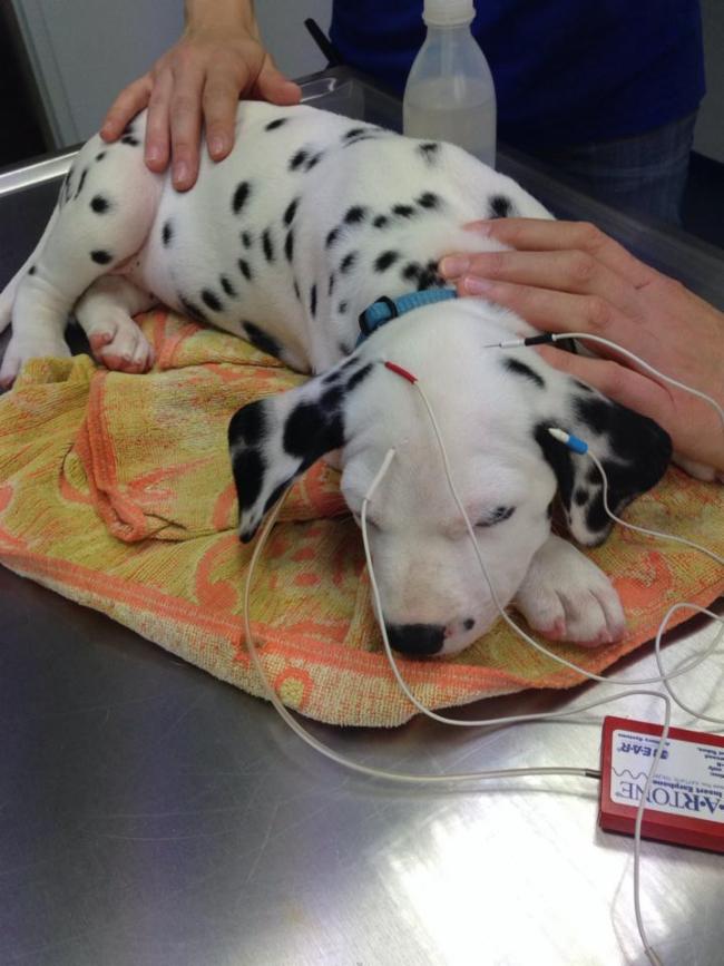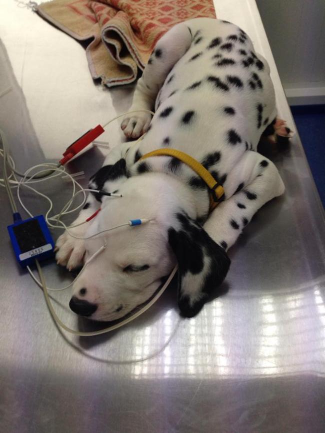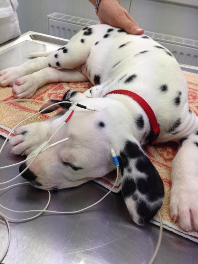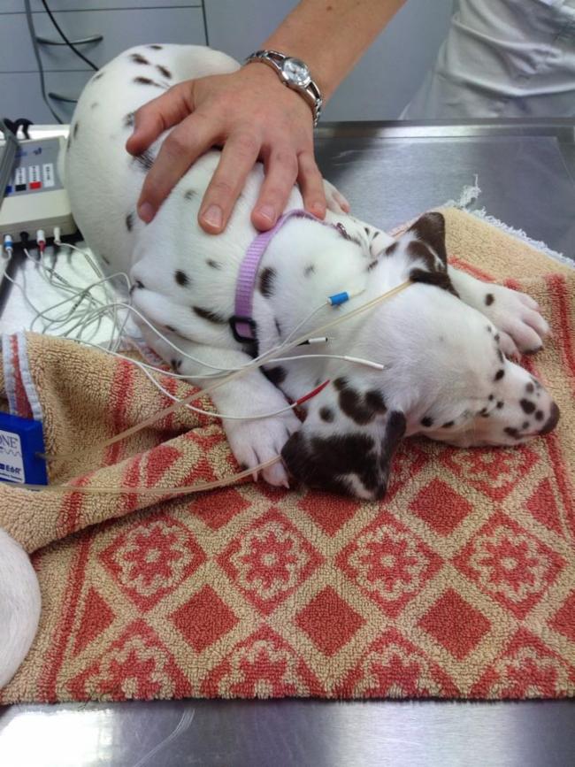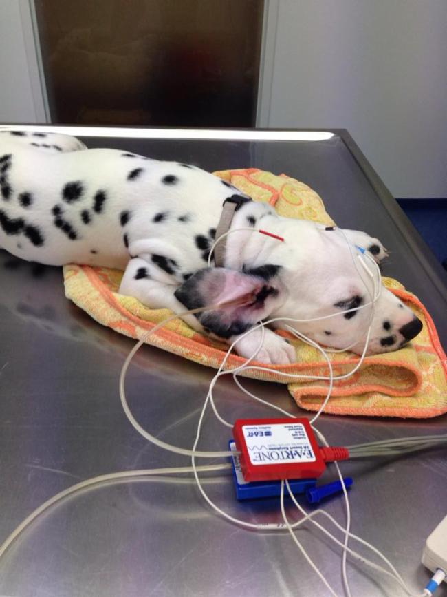 Eine ganz spannende Woche sollte die 7. Woche für die C-chen und natürlich auch für uns werden. Am 9. Oktober ging es zur AEP-Untersuchung zu Dr. Diel nach Meerbusch. Wir waren uns sehr sicher das alles gut laufen würde, schließlich hat man die Welpen wochenlang beobachtet, immer wieder getestet und es waren keine Auffälligkeiten zu erkennen - dennoch bleibt eine gewisse Spannung. Morgens wurden die 10 C-chen alle ins präparierte und Auto gebracht, und dann auch zügig in Richtung Meerbusch gestartet. Elena war natürlich mit, und nahm auf dem Rücksitz platz. Anfangs wurde sich laut beschwert, aber als wir losfuhren war nach wenigen km ruhe eingeehrt und die Welpen waren alle eingeschlummert! Mitten im Berufsverkehr kamen wir etwas verspätet an, aber kein Problem und es ging zügig mit der Untersuchung ohne lange Wartezeit los. Ein Welpe nach dem anderen wurde ganz sanft, ohne Narkose mit einem Saft etwas schläfrig gemacht, damit die Elektroden angebracht werden konnten. Alle Welpen haben alles ganz tapfer über sich ergehen lassen, und toll mitgemacht! Ein Ohr nach dem anderen zeigte perfekte Hörkurven! So können wir stolz berichten: