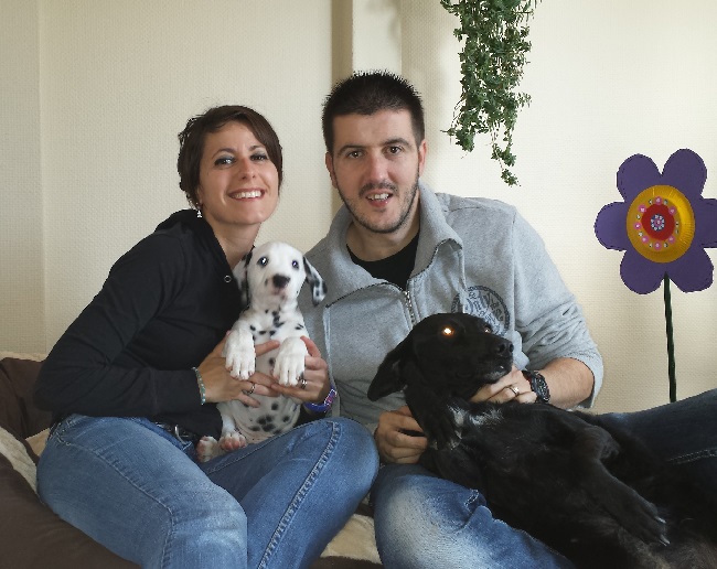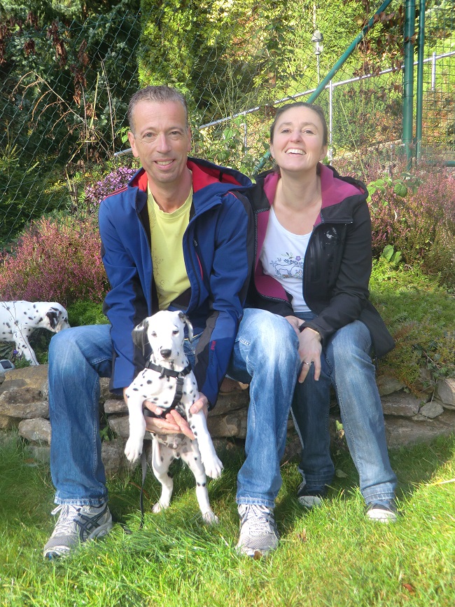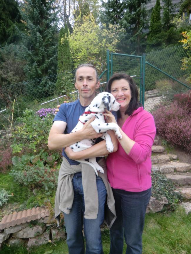 Unser "Charming Lover Boy" ist ein wahrer "Eyecatcher" und hat viele in seinen Bann gezogen! So auch Michael & Silvia aus Bitburg. Ein Dalmimix Rüde gehört bereits zur Familie, sowie eine ältere Hundedame. Nach reiflicher Überlegung und bereits über beide Ohren in den hübschen Charmebolzen verliebt, haben sie sich entschlossen das Abenteuer Welpe in Angriff zu nehmen! In Zukunft wird er auf den schönen Namen "Titus" hören! Den "Mr. Charming" wird man auch mal auf der ein oder anderen Ausstellung zu sehen bekommen!