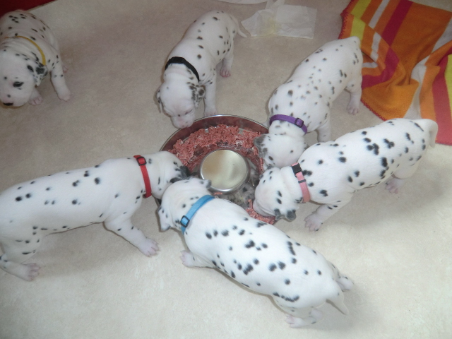 Die ersten Mahlzeiten gab es auch am vergangenen Wochenende. Diese wurde von den D-chen restlos verputzt und der Welpennapf bis auf den letzten Fleischbrocken poliert. :-D