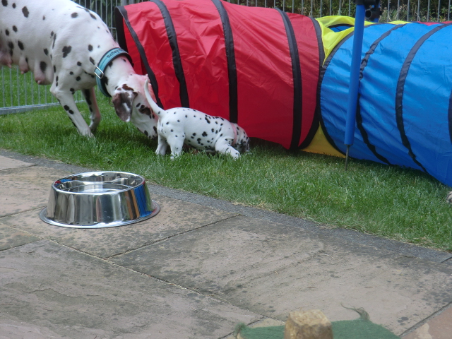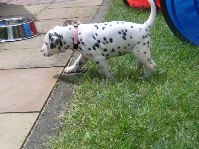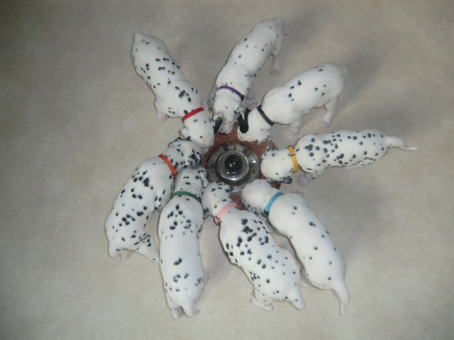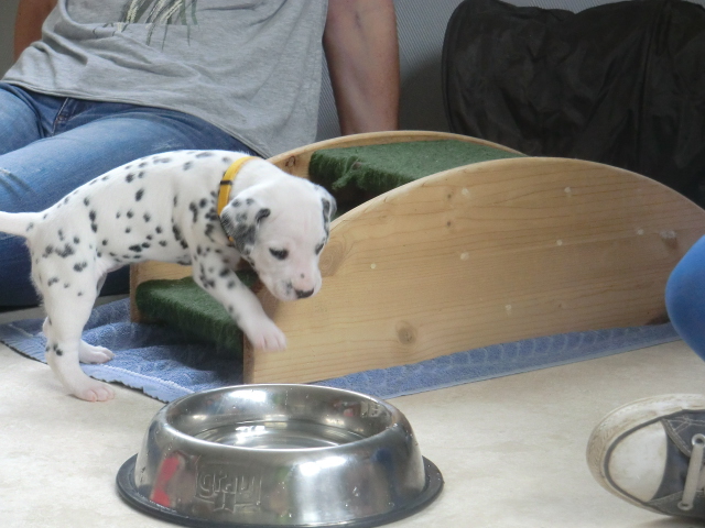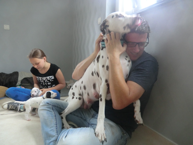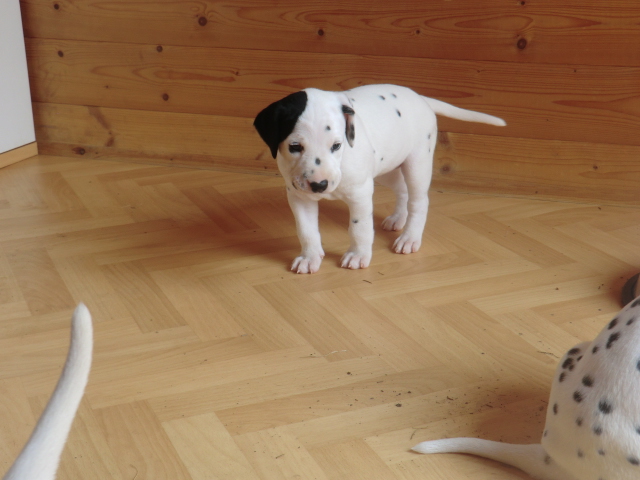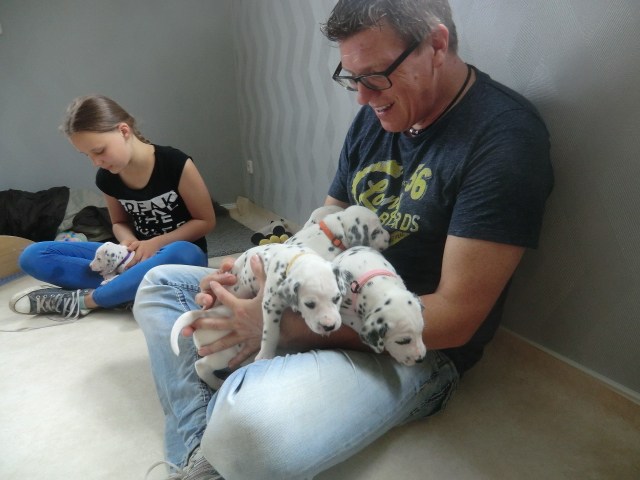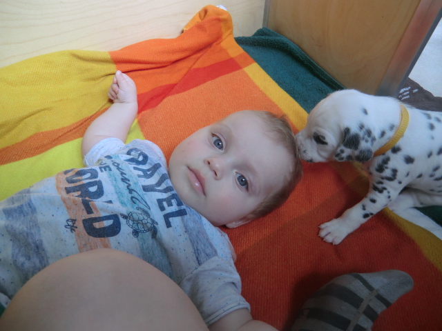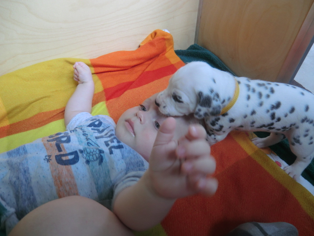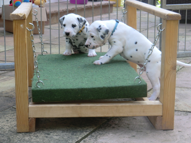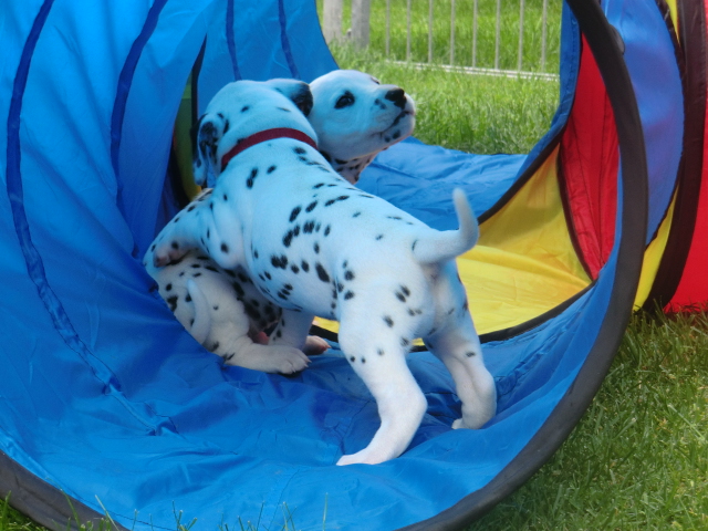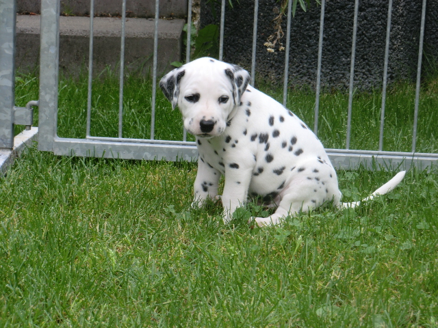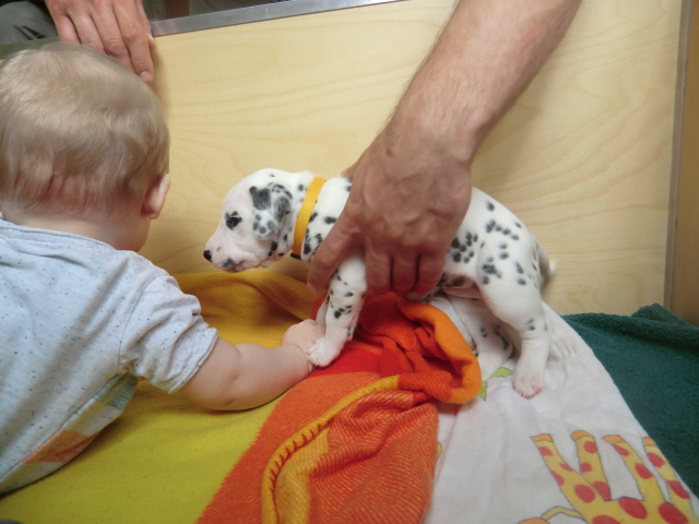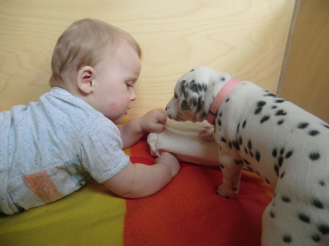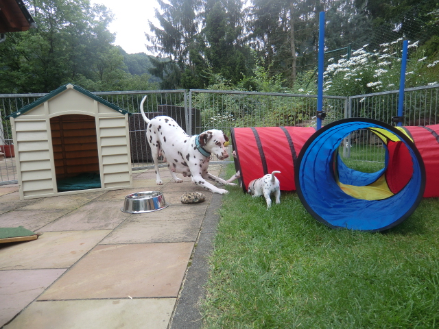Nachdem die kleinen E-chen eine Woche im Indoorauslauf bei uns im Wohnzimmer wohnten, wurde zum Ende der 4. Woche der Outdoorauslauf mit zahlreichen Spielmöglichkeiten aufgebaut. Die E-chen fühlten sich sofort Dalmiwohl und haben riesen Spaß draußen. Fortlaufend haben wir Besuch für unsere E-chen und alle sind begeistert von unserer freundlichen und aufgeschlossenen Bande. Auch unsere Sohn Leon hat großen Spaß mit den E-chen - Frau Rosa ist schon jetzt seine beste Freundin! Der Essensplan der E-chen wurde auch erweitert und mittlerweile lässt Bailey ihre Babys nur noch selten an die Milchbar.