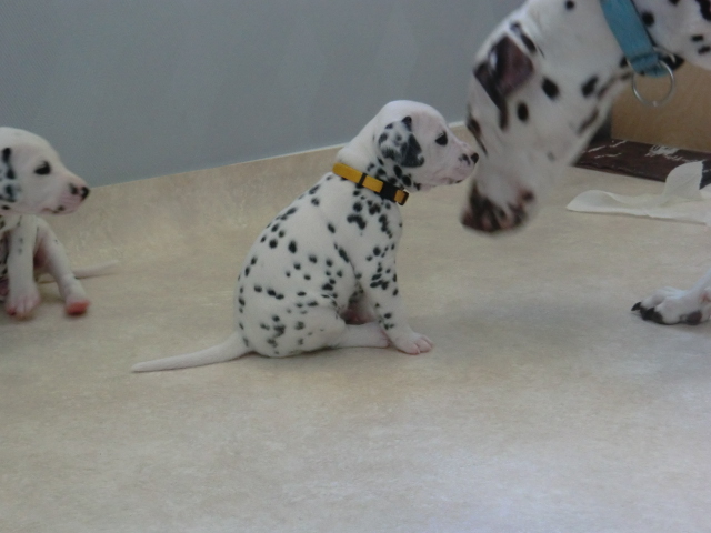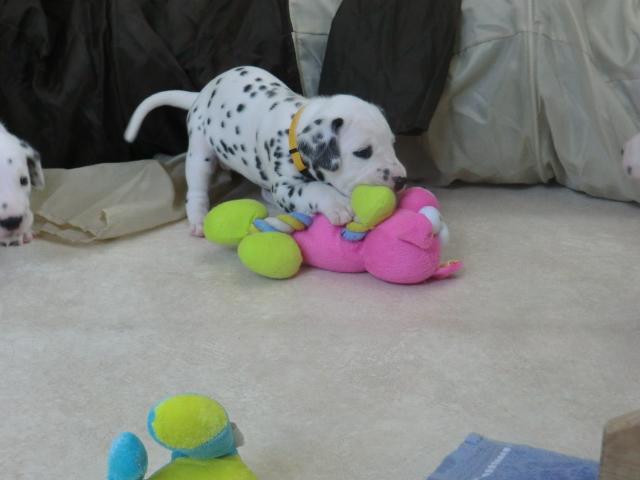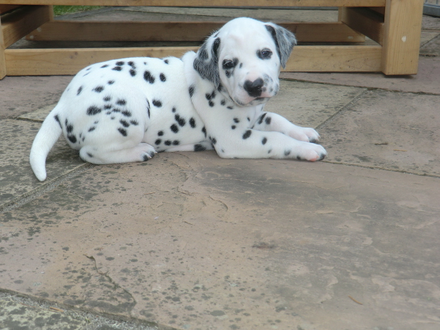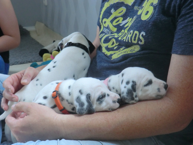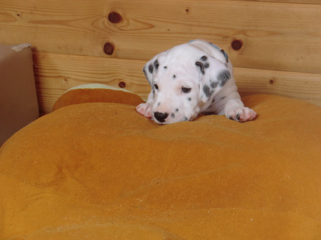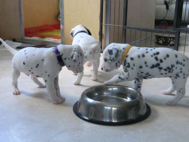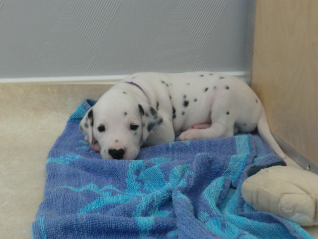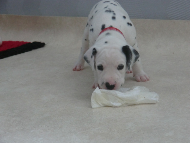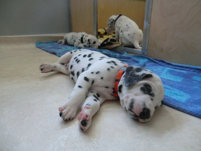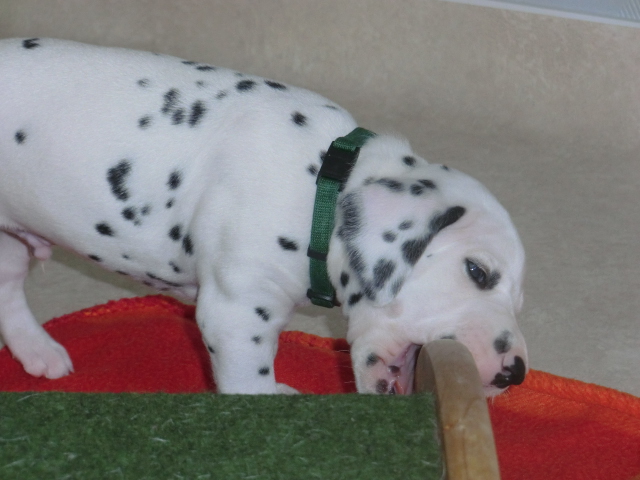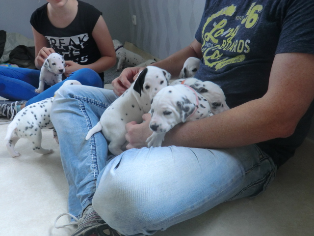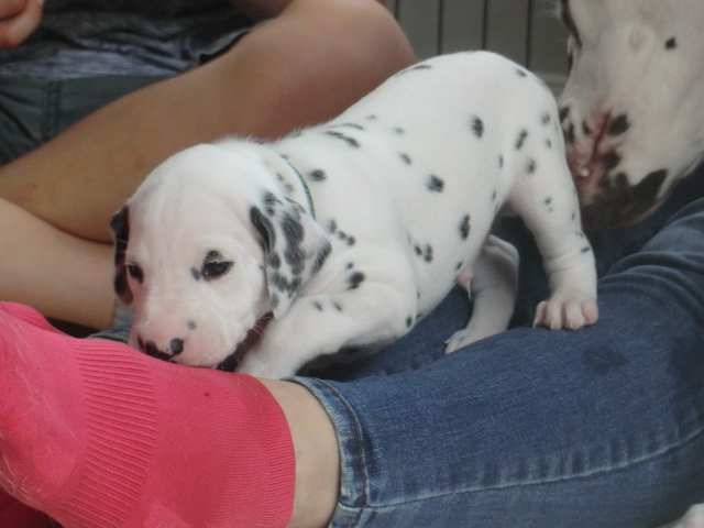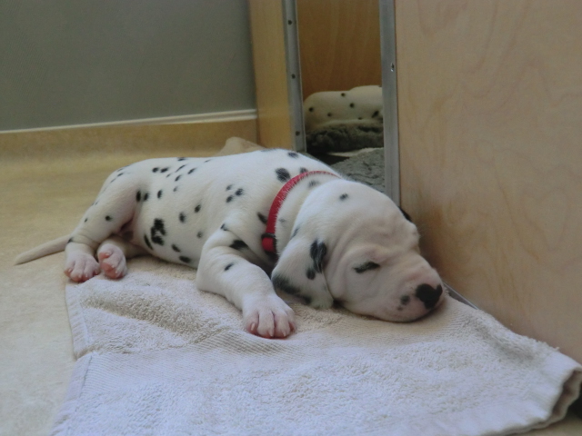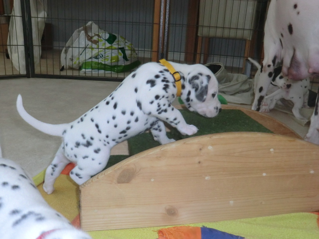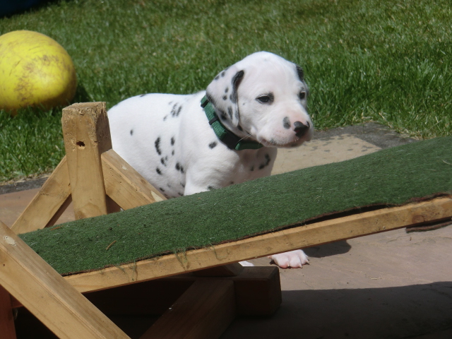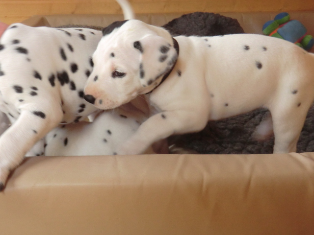 Nachdem die kleinen E-chen eine Woche im Indoorauslauf bei uns im Wohnzimmer wohnten, wurde zum Ende der 4. Woche der Outdoorauslauf mit zahlreichen Spielmöglichkeiten aufgebaut. Die E-chen fühlten sich sofort Dalmiwohl und haben riesen Spaß draußen. Fortlaufend haben wir Besuch für unsere E-chen und alle sind begeistert von unserer freundlichen und aufgeschlossenen Bande. Auch unsere Sohn Leon hat großen Spaß mit den E-chen - Frau Rosa ist schon jetzt seine beste Freundin! Der Essensplan der E-chen wurde auch erweitert und mittlerweile lässt Bailey ihre Babys nur noch selten an die Milchbar.