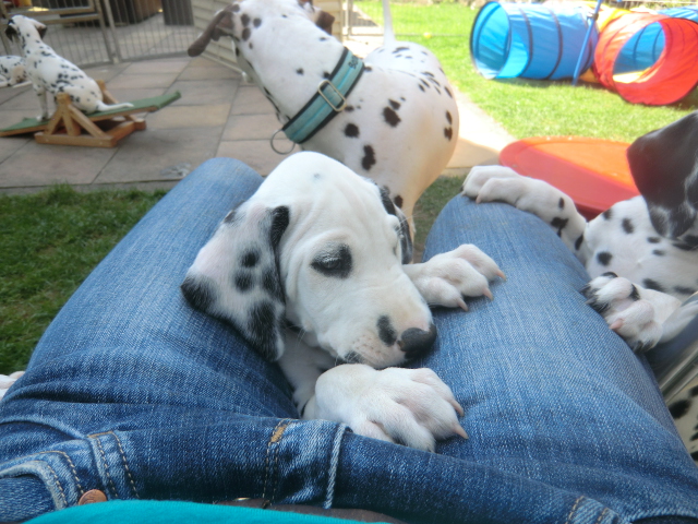 Die 8. Woche war eine sehr spannende Woche. Sie begann für die E-chen mit einer ersten längeren Autofahrt zur AEP Untersuchung nach Düsseldorf - Meerbusch. Die E-chen waren alle sehr brav und haben die Autofahrt gut gemeistert! Einen Tag später stand dann schon die Wurfabnahme auf dem Programm. Vielen Dank an unsere Zuchtwartin Heike Schacht für die einwandfreie Wurfabnahme und tolle Betreuung! Ein bis auf Platten fehlerfreier Wurf, wir sind zufrieden mit dem Ergebnis.