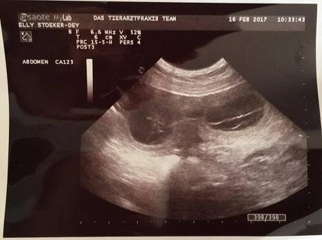 Früh morgens ging es mit Leon und Elena in Richtung Zülpich zu unserem Tierarzt Dr. Müller. 26 Tage nach der Hochzeit stand heute die Ultraschalluntersuchung an. Da alle Körperlichen- und Verhaltensveränderungen ziemlich sicher darauf hindeuteten das es geklappt hat, war ich mir sehr sicher heute ein erstes Foto von den F-chen zu erhalten. Ich sollte recht behalten :-)