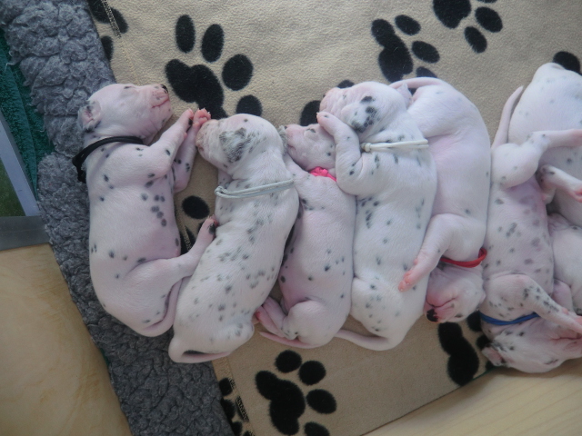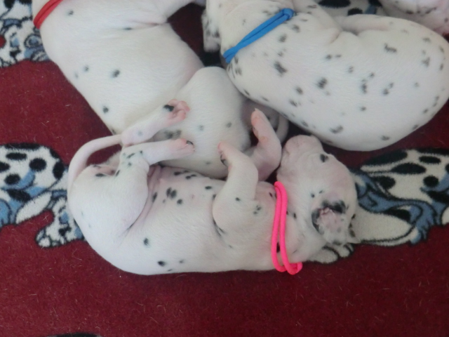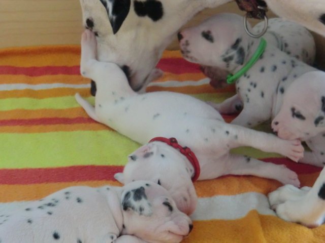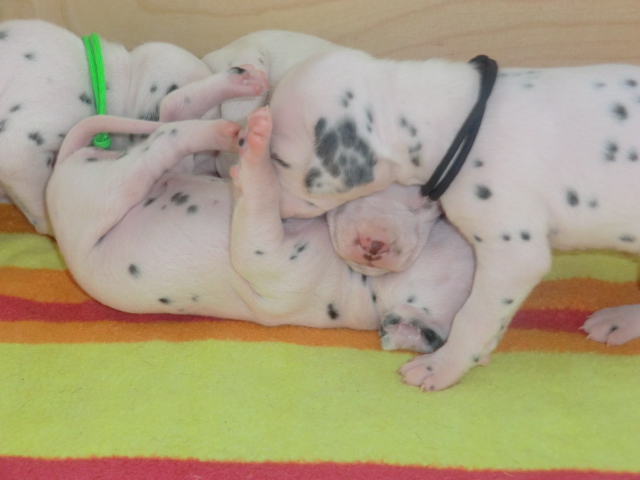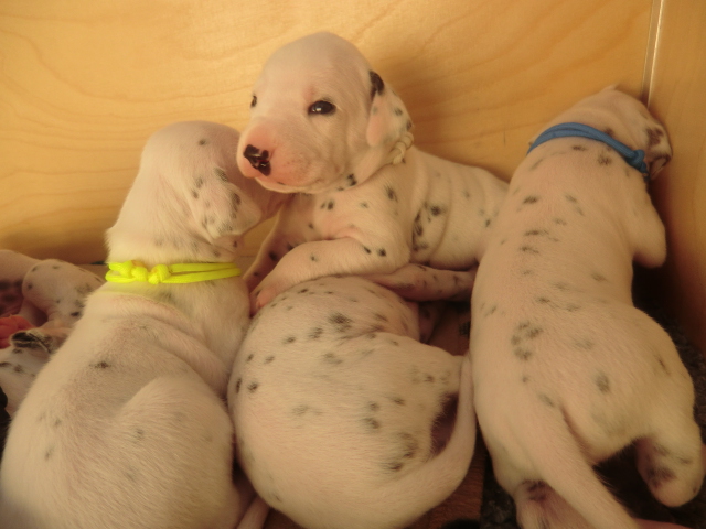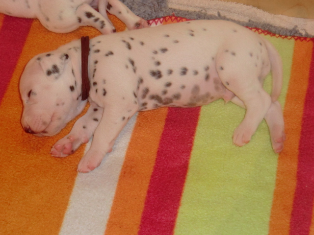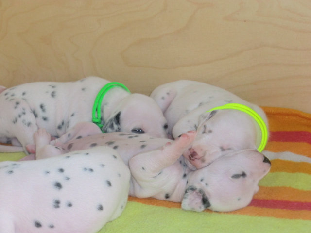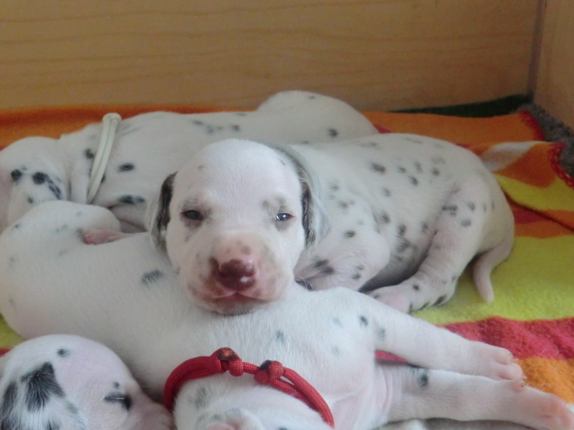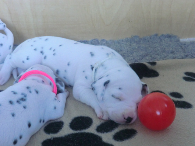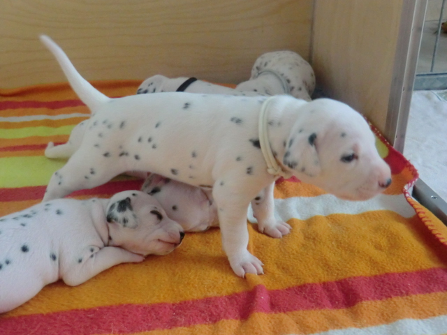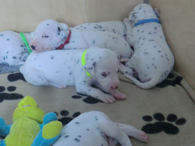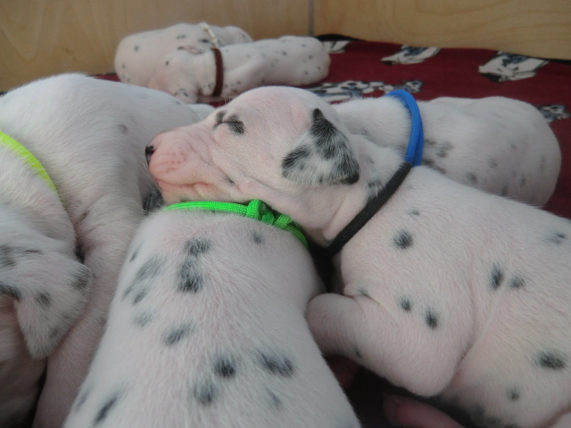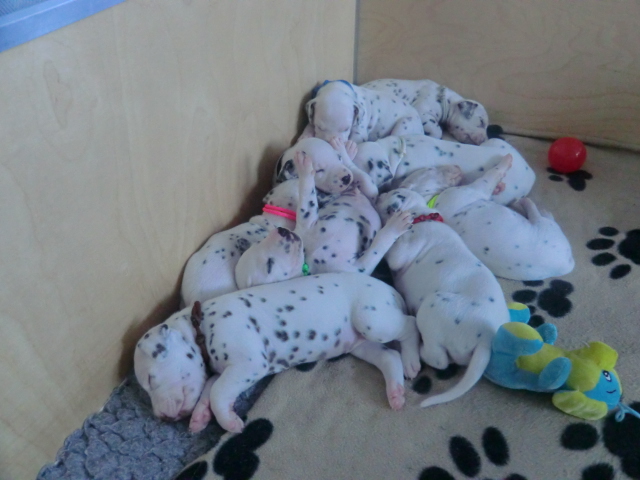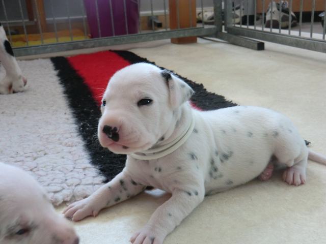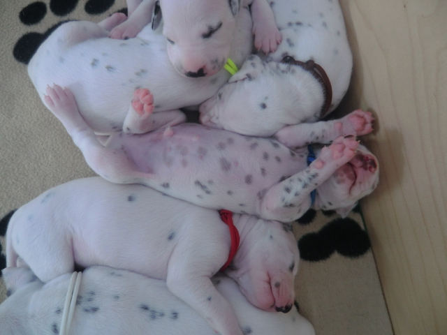 Unsere F-chen entwickeln sich prächtig! Alle Welpen haben die Augen geöffnet und schauen uns mit wunderschönen dunklen Augen an. Auch erfreuliche Nachrichten bezüglich des Gehörs gibt es: Alle Welpen hören!! Ob wirklich beide Ohren einwandfrei funktionieren wird uns ganz sicher erst die AEP Untersuchung in der 8. Woche verraten.