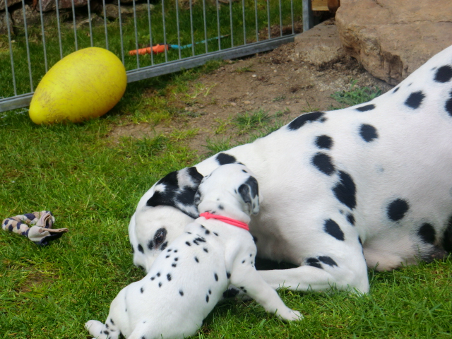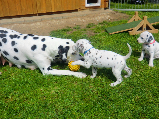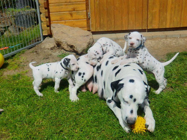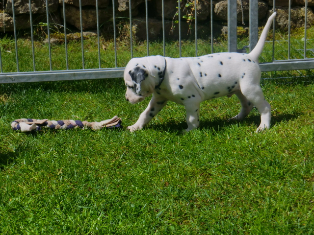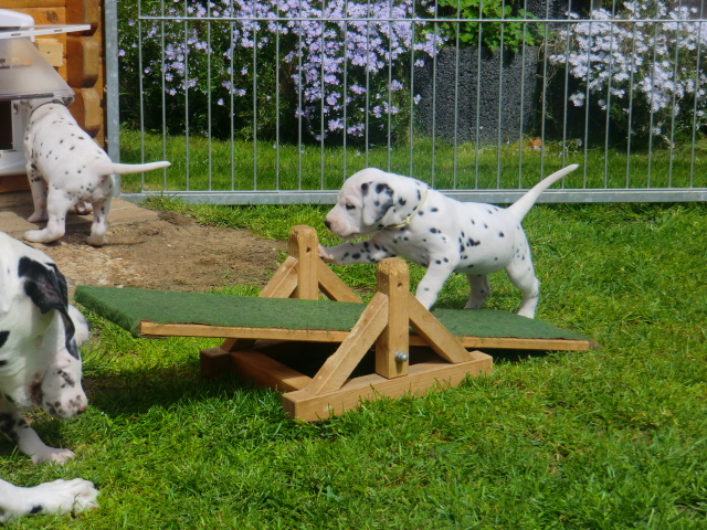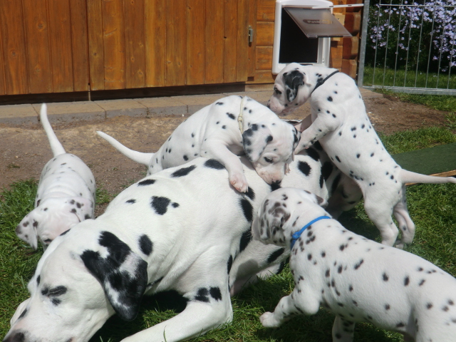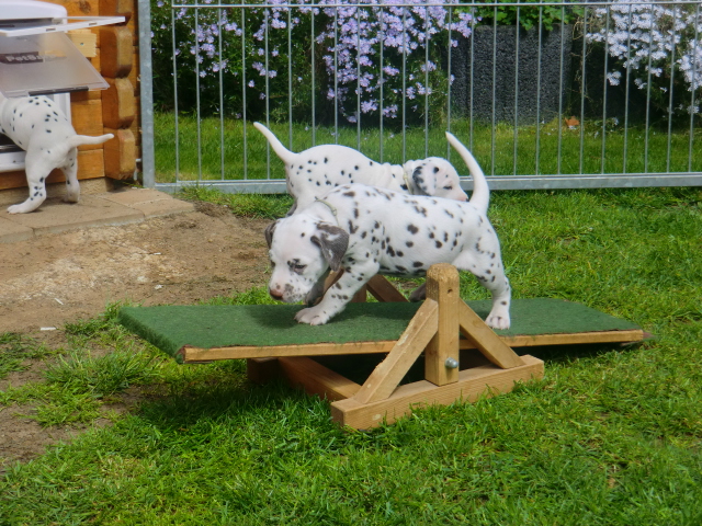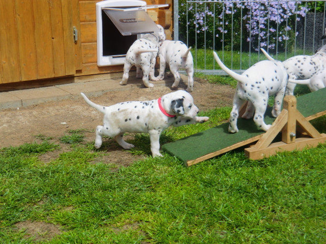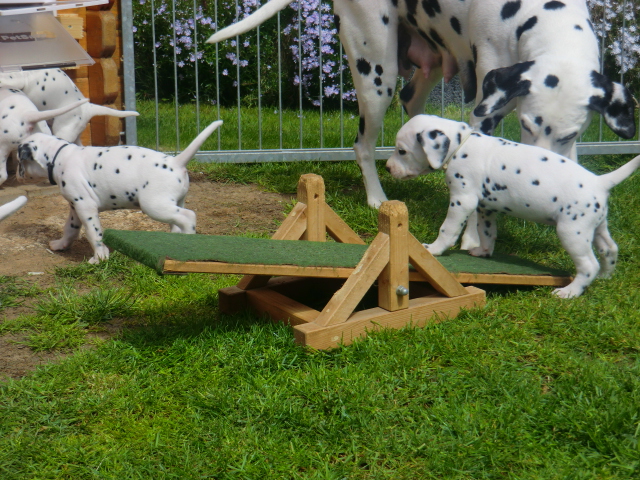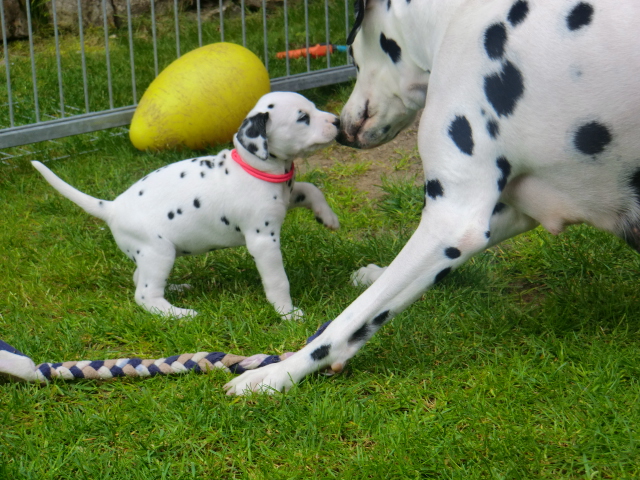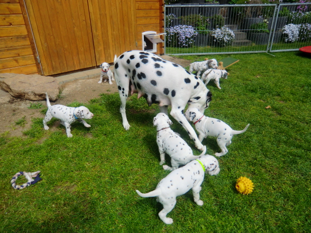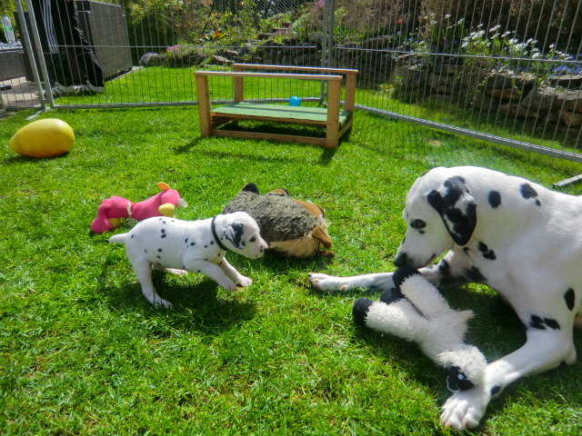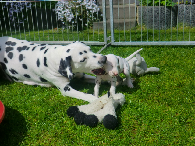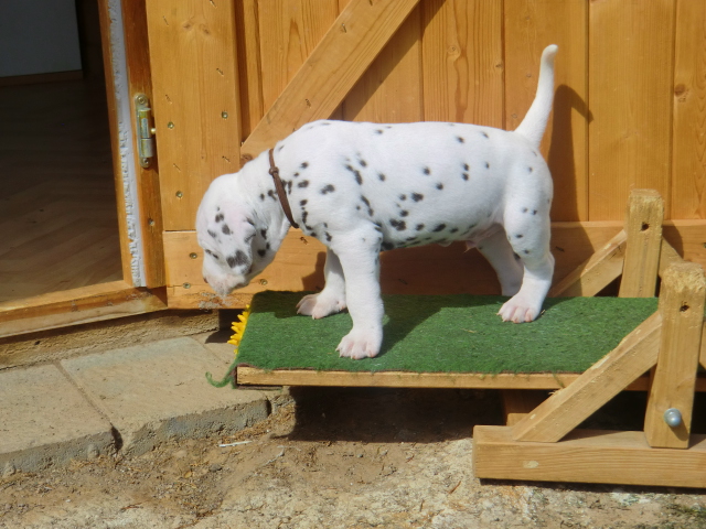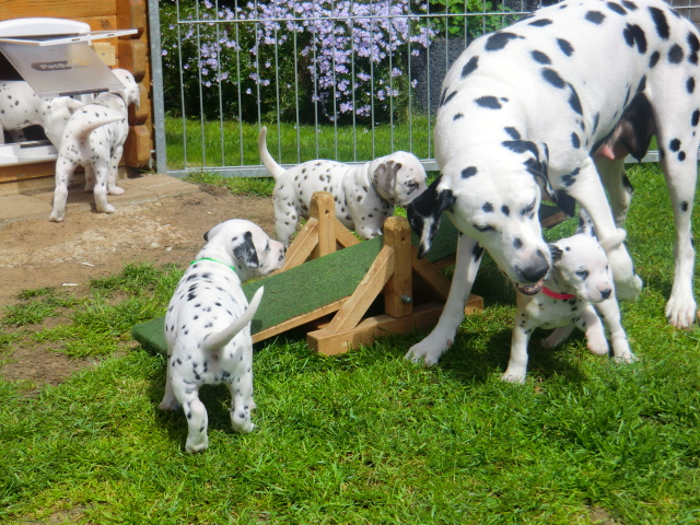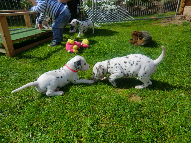 Zum Anfang der 5. Woche spielte das Wetter endlich mit und die F-chen durften das erste Mal raus in den Garten. Es war wieder schön zu sehen wie offen und fröhlich die kleinen die neue Umgebung erkundeten. Unser Sohn hat ebenfalls viel Spaß mit den kleinen auf ihrem Spielplatz - die beste positive Prägung auf Kinder für unsere F-chen die wir uns wünschen können. Viel Besuch von den neuen Welpeneltern, Bekannten und Freunden hatten unsere Minipünktchen auch wieder, hier ist zur Zeit immer was los!