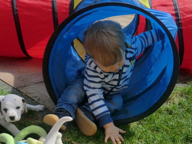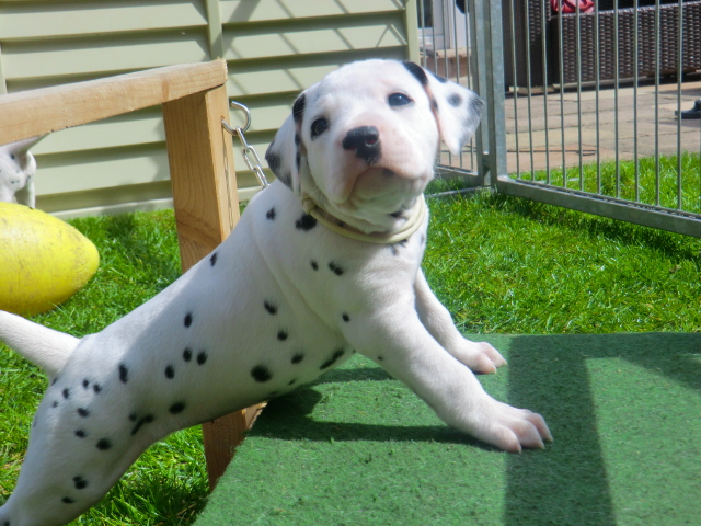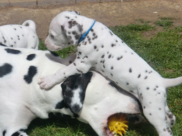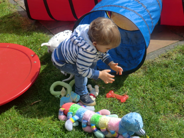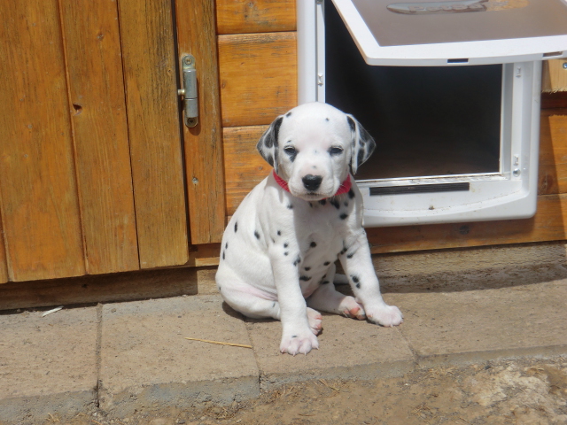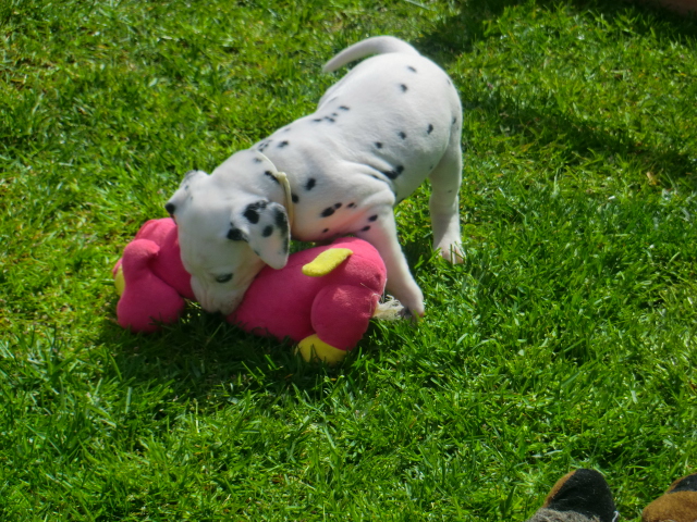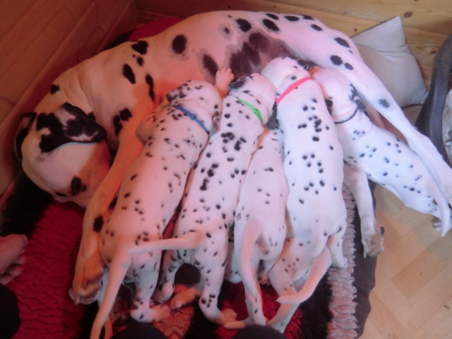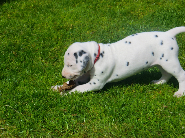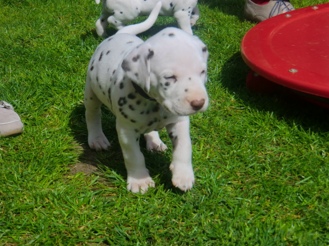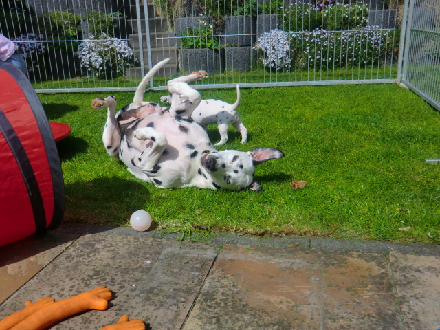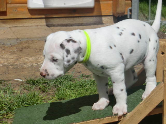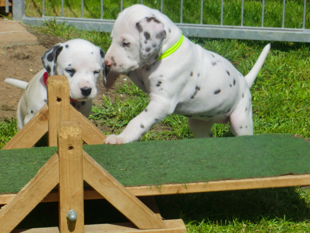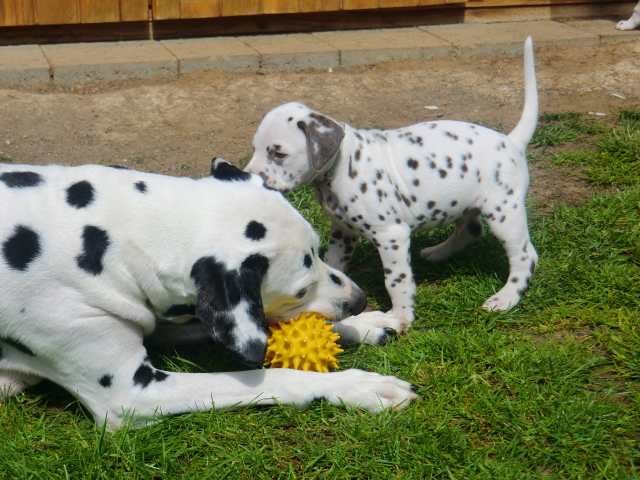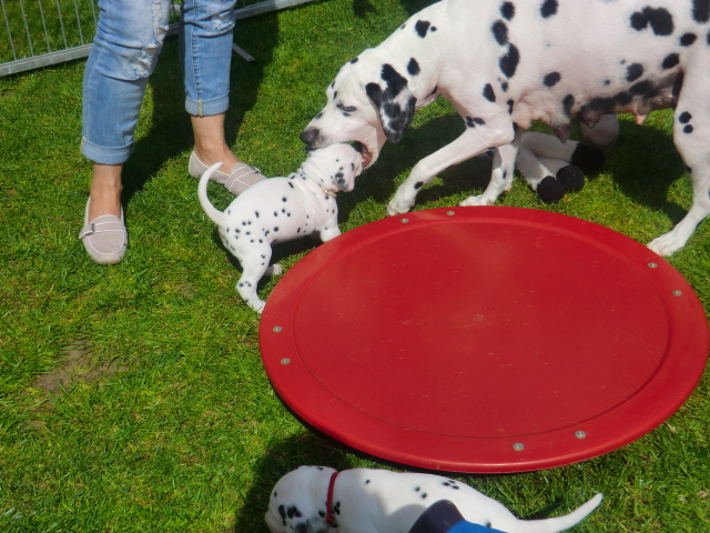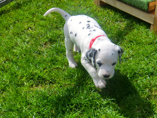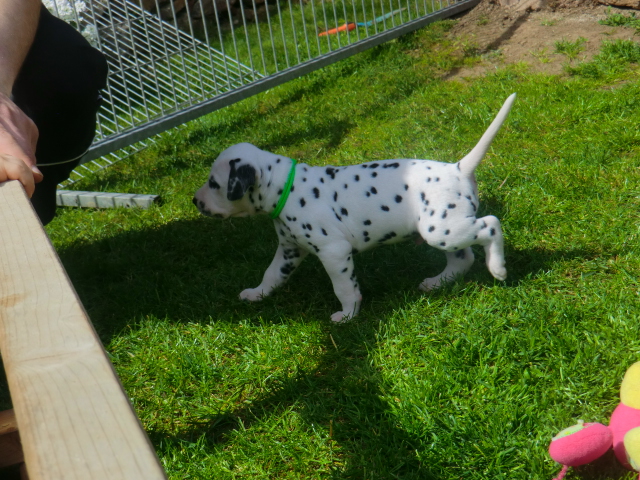 Zum Anfang der 5. Woche spielte das Wetter endlich mit und die F-chen durften das erste Mal raus in den Garten. Es war wieder schön zu sehen wie offen und fröhlich die kleinen die neue Umgebung erkundeten. Unser Sohn hat ebenfalls viel Spaß mit den kleinen auf ihrem Spielplatz - die beste positive Prägung auf Kinder für unsere F-chen die wir uns wünschen können. Viel Besuch von den neuen Welpeneltern, Bekannten und Freunden hatten unsere Minipünktchen auch wieder, hier ist zur Zeit immer was los!