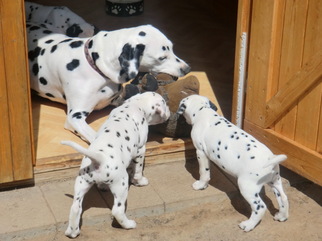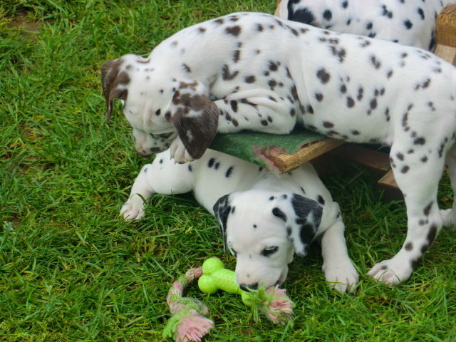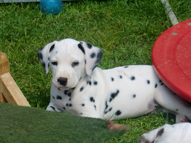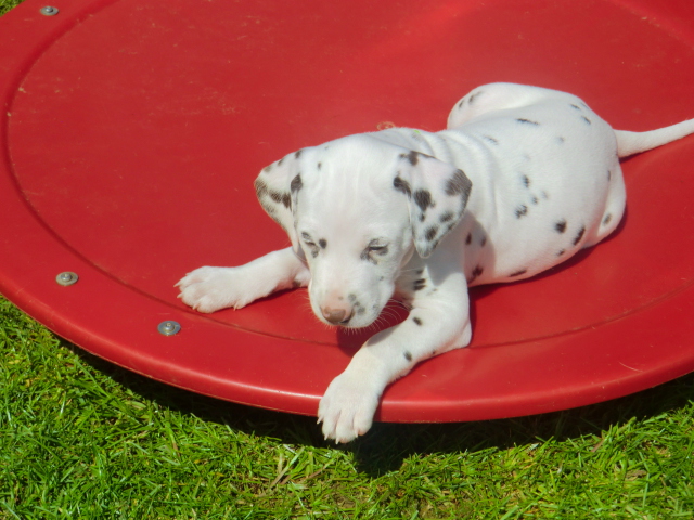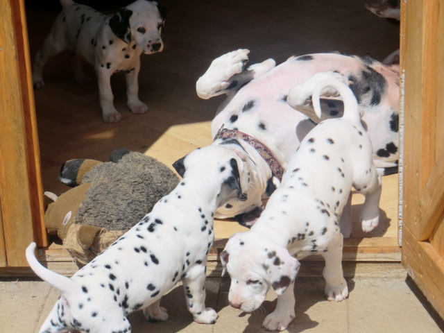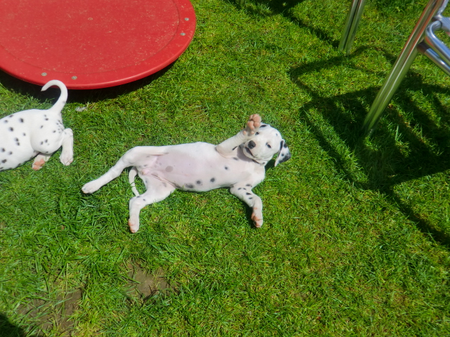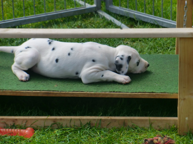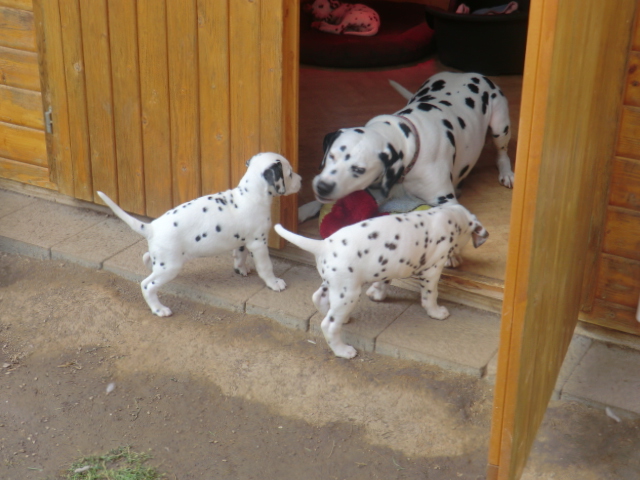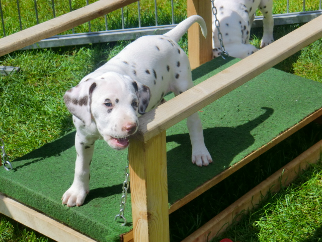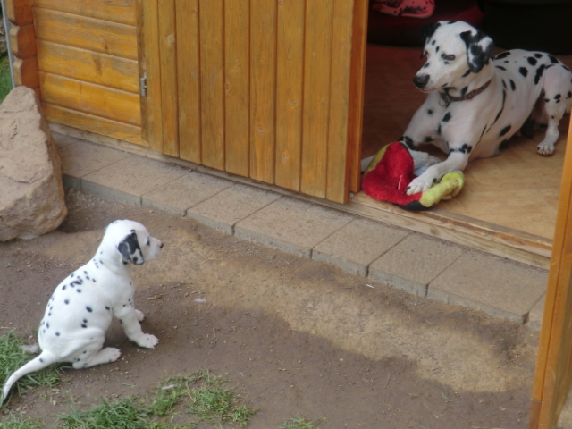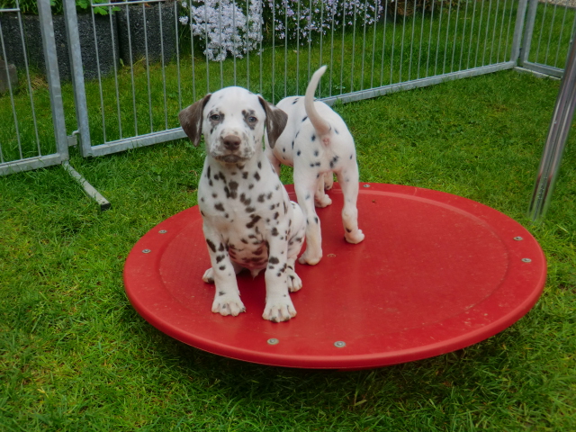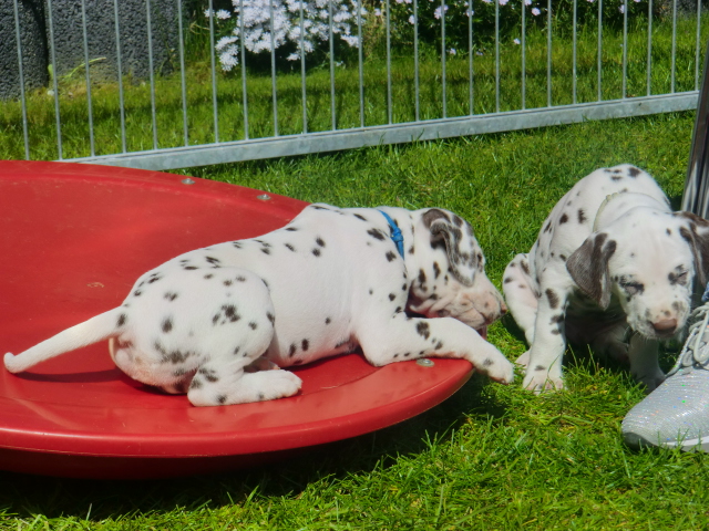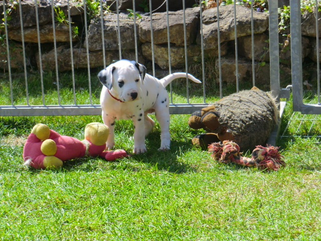 6. Woche ___________________________________________ Die 6. Woche ist wie im Flug vergangen und unsere F-chen sind bereits ordentlich gewachsen! Regelmäßiger Besuch steht für die Welpen auf dem Programm und die F-chen freuen sich immer riesig über die vielen "großen und kleinen Menschen" die zum kuscheln und anknabbern lassen vorbei kommen. Besonders beliebt sind natürlich Schuhe mit Schnürsenkel! Von den neuen Familien der F-chen werden keine Wege gescheut um das neue Familienmitglied so oft wie möglich zu besuchen - das freut uns natürlich sehr!Es gab mal wieder eine "leckere" Wurmkur für die Minis, und auch der Speiseplan wurde umfangreich erweitert, da Mama Elena der Meinung war das es Zeit ist die Milchbar zu schließen - wer kann es ihr verübeln bei den spitzen Welpenzähnen...Da die Halsbänder wetterbedingt in die Waschmaschine mussten, sind die meisten Bilder ohne die Erkennungsbändchen ;-)