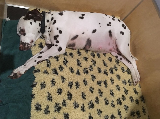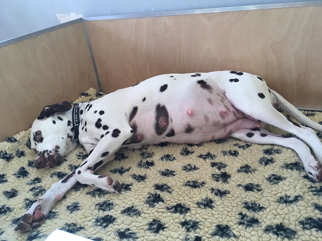5. Woche | Die Hündin hört auf, die Beine anzuziehen, weil das Gewicht ansteigt und die Welpen sich drehen. Das Anschwellen der weiblichen Scham wird merkbarer. Bitte achten Sie auf das Gewicht der Hündin und überfüttern Sie nicht. Die Herzschlag ist aufgrund der ansteigenden Flüssigkeit in der Gebärmutter nicht mehr länger als Diagnosemethode nutzbar. |