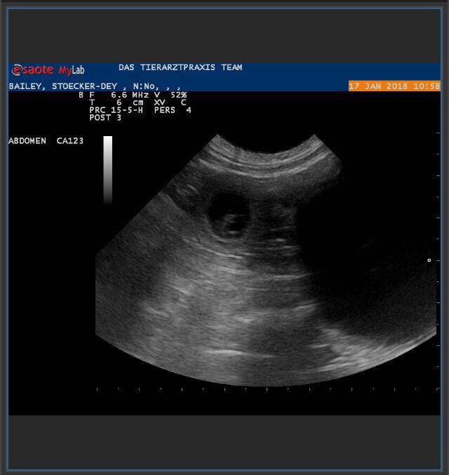 Fr, 26.01.2018 | Die Ausbildung der Organe ist abgeschlossen.Die Föten sehen nun aus wie Hunde. Kopf und Rumpf sind unterscheidbar. Das Geschlecht ist bestimmbar. Die Fellfarbe beginnt sich zu entwickeln. Der Herzschlag der Föten ist per Stetoskop hörbar. Die Zitzen der Hündin werden dunkler und schwellen an. |