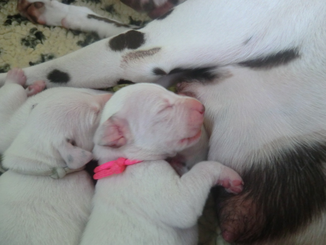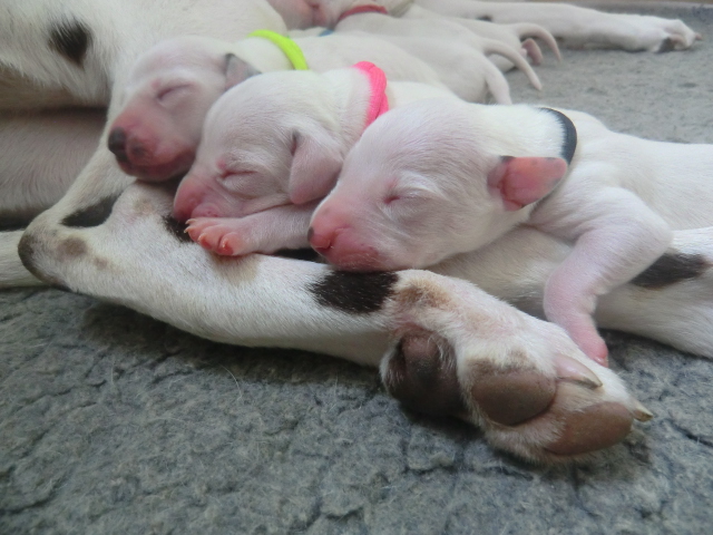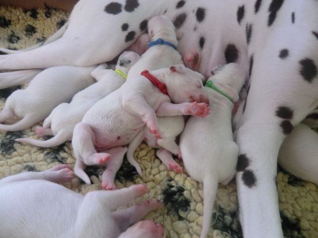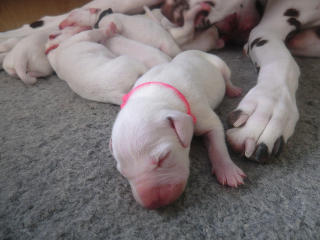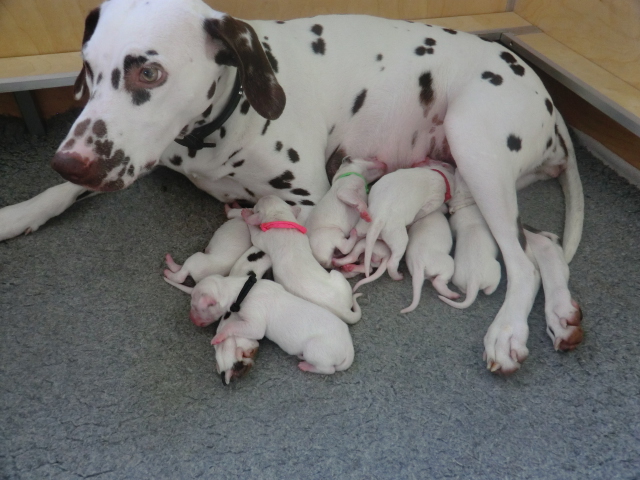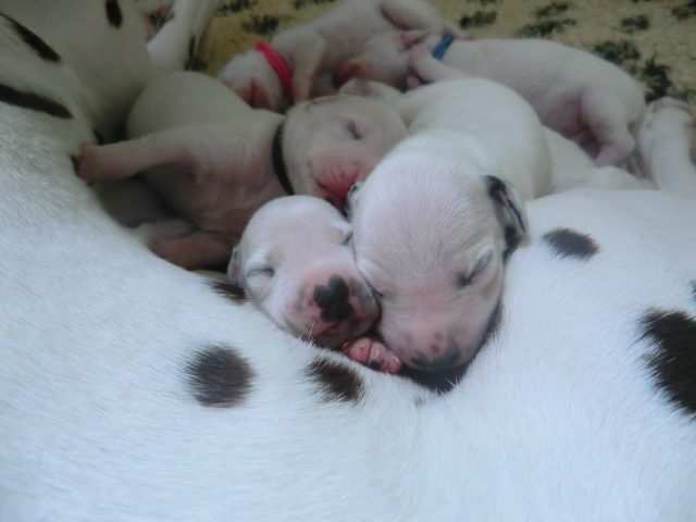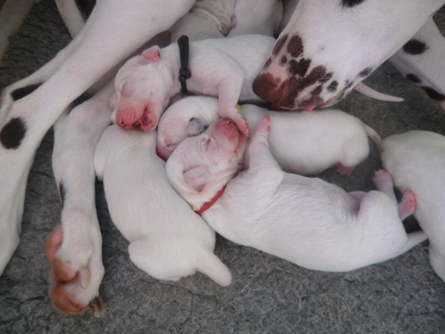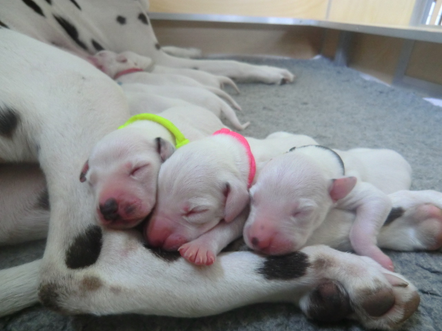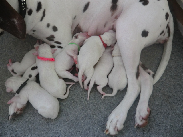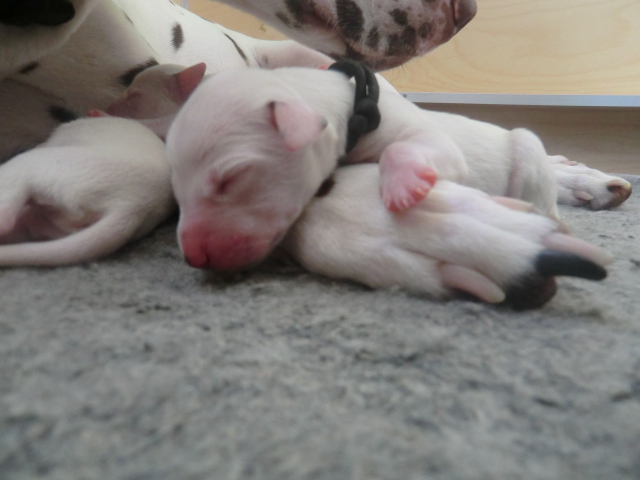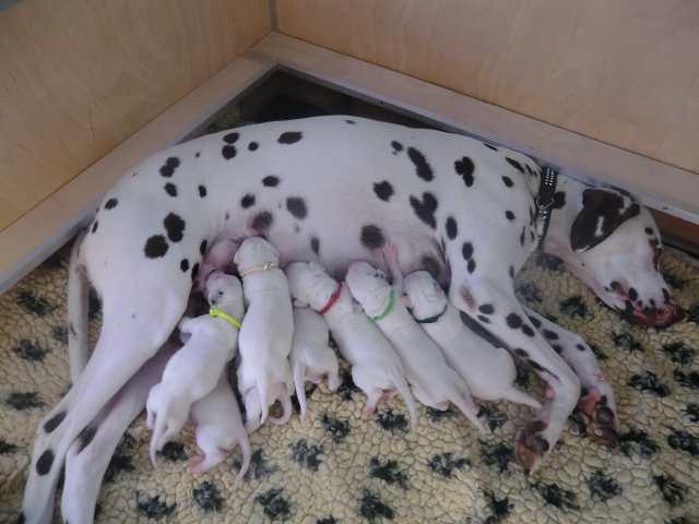 Der kleinen Fleckenfamilie geht es sehr gut! Bailey kümmert sich vorbildlich um ihre Welpen und ist eine sehr Instinktsichere Dalmimama! Die Welpen gehen den ganzen Tag ihrer Lieblingsbeschäftigung nach: trinken und schlafen! :-) Das schlägt sich auch schon auf der Waage nieder und alle G-chen nehmen sehr gut zu!