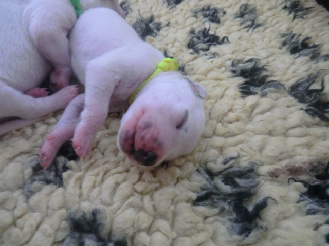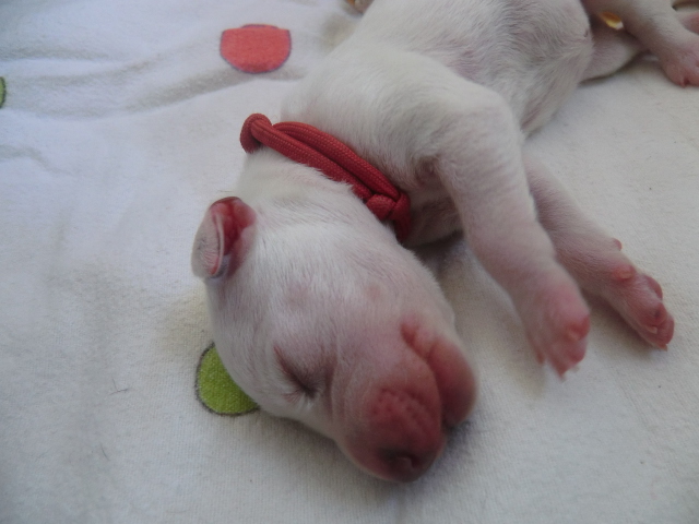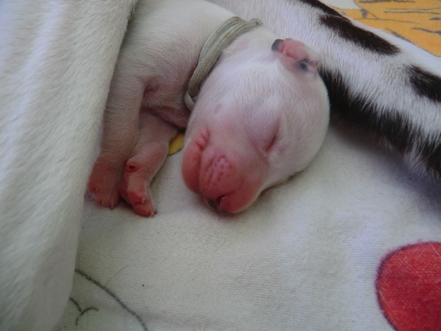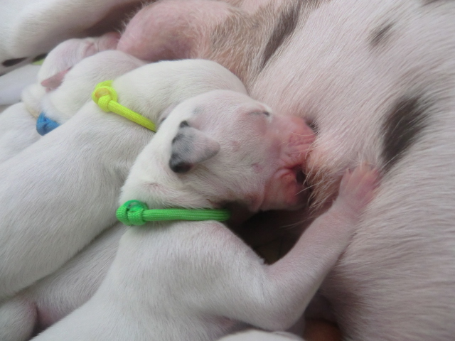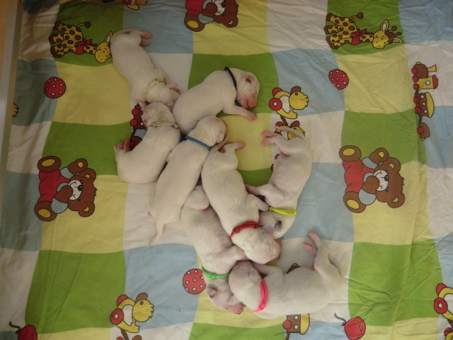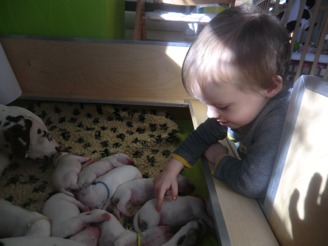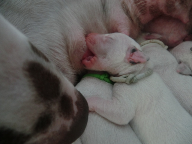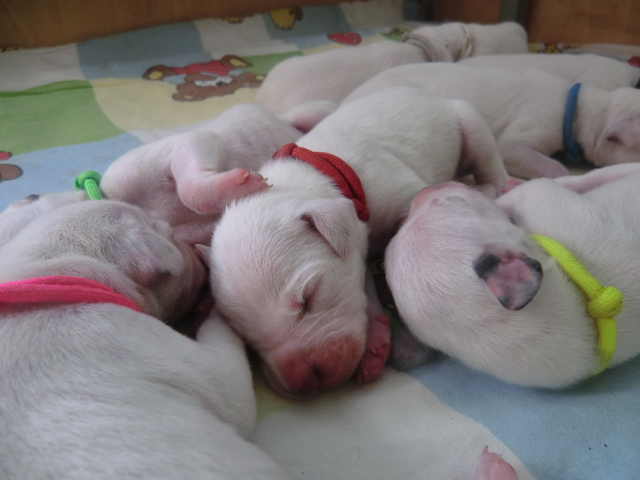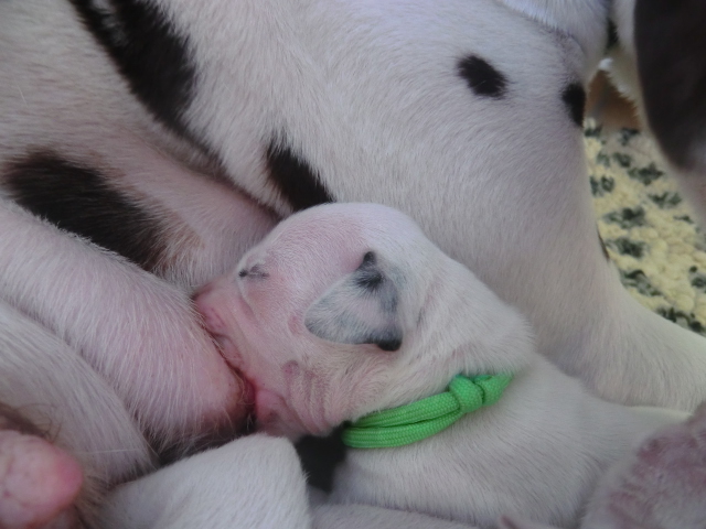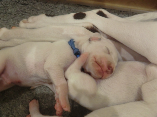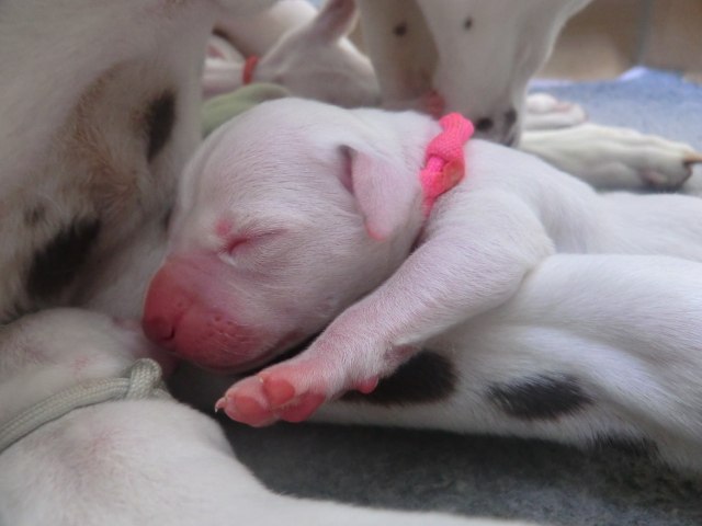 Der kleinen Fleckenfamilie geht es sehr gut! Bailey kümmert sich vorbildlich um ihre Welpen und ist eine sehr Instinktsichere Dalmimama! Die Welpen gehen den ganzen Tag ihrer Lieblingsbeschäftigung nach: trinken und schlafen! :-) Das schlägt sich auch schon auf der Waage nieder und alle G-chen nehmen sehr gut zu!