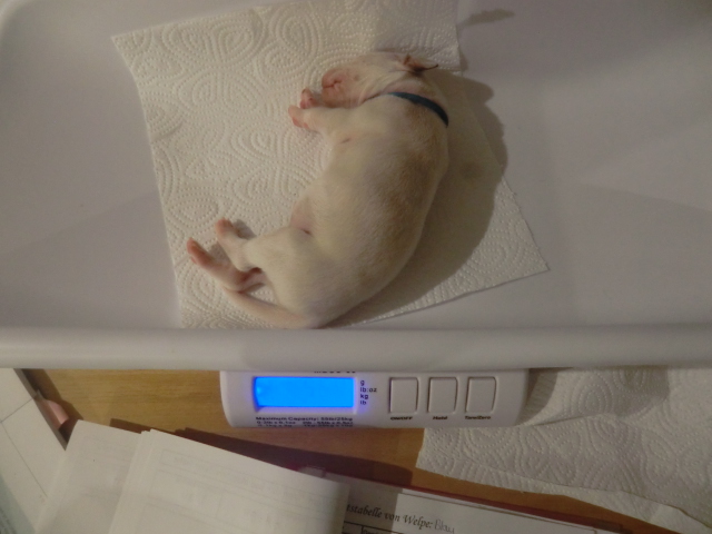 Zwei mal am Tag (morgens und Abends) werden die Welpen gewogen und kontrolliert ob alle auch gut zunehmen. Frau Rot ist eindeutig unser Mops der Woche :-D