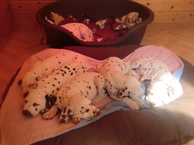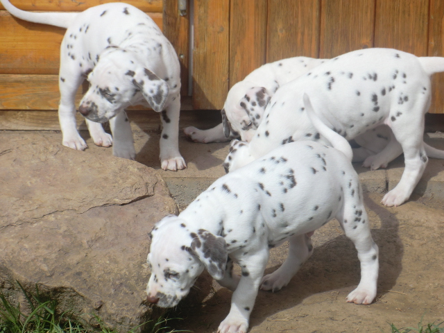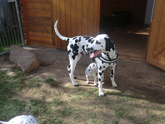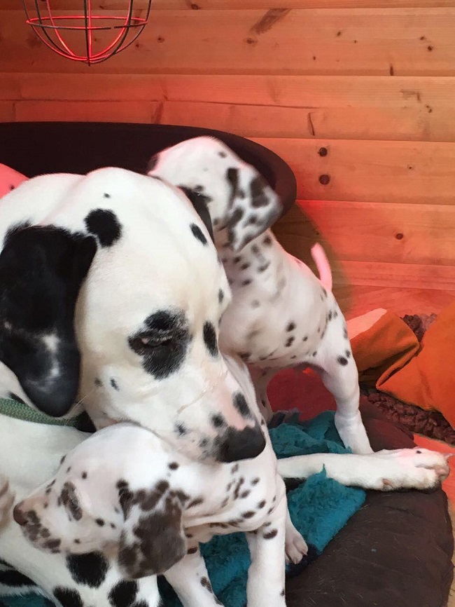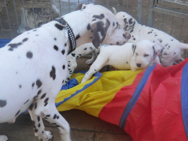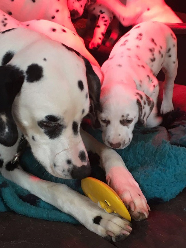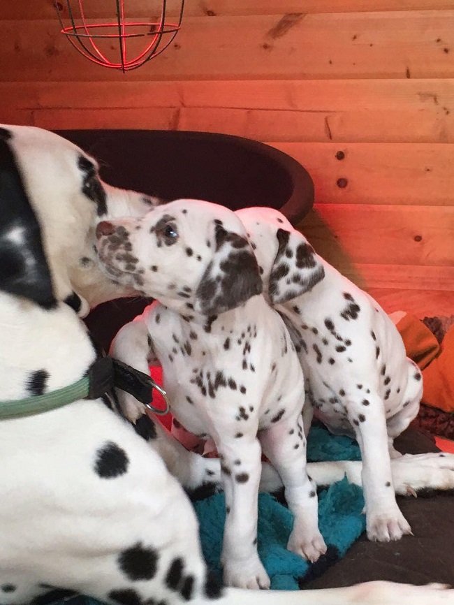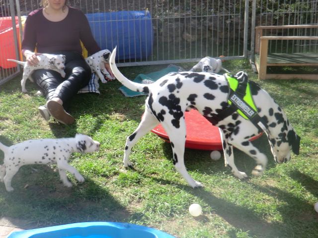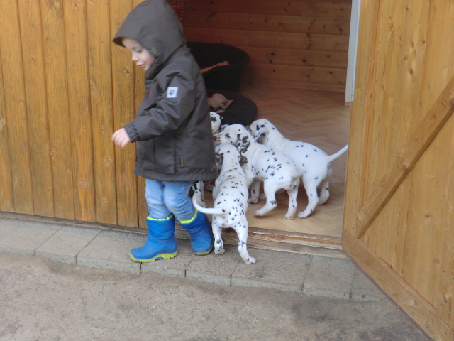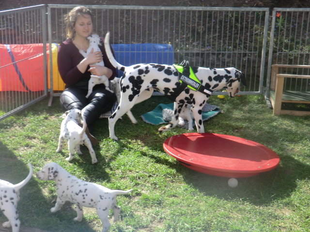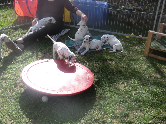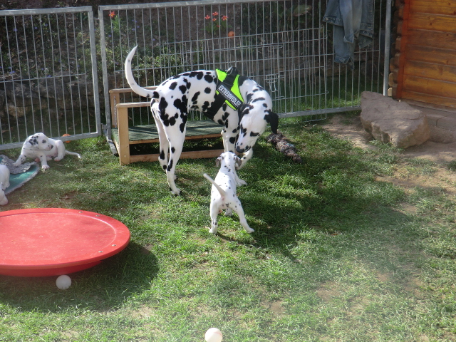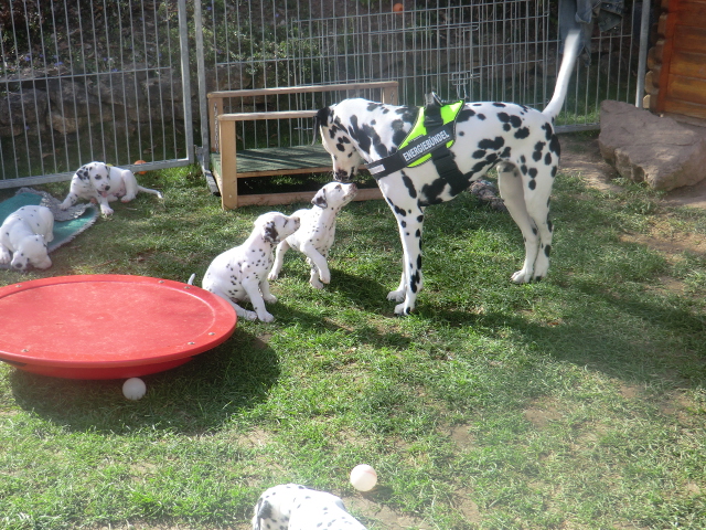 Mama Bailey guckt immer mal wieder nach den Welpen, geht aber immer weniger zu ihren Punktekindern