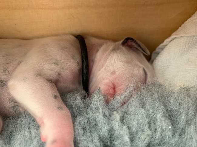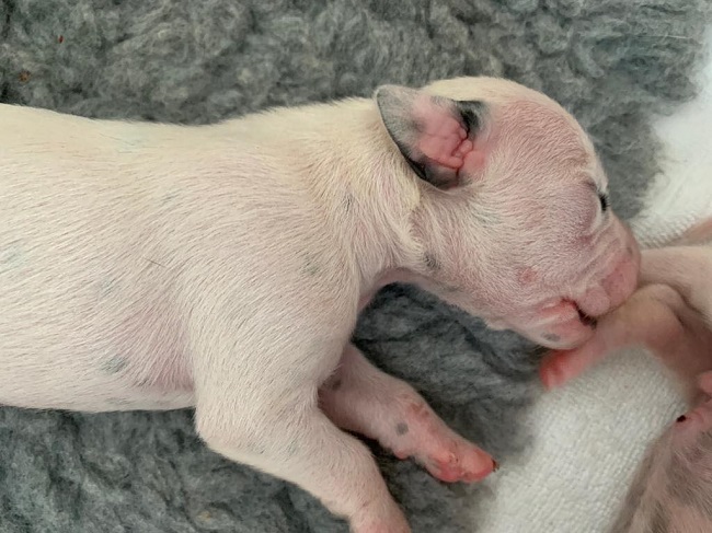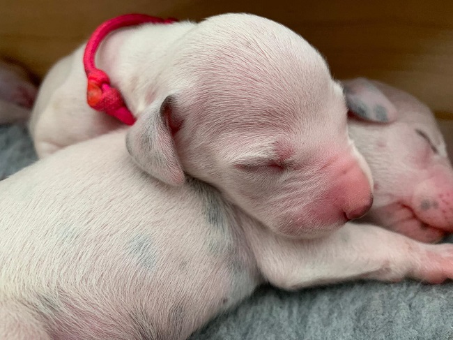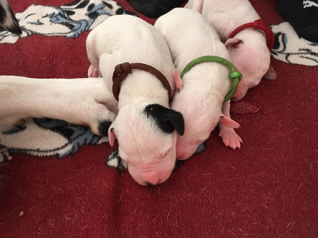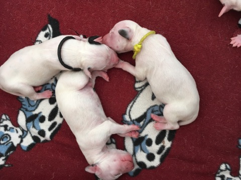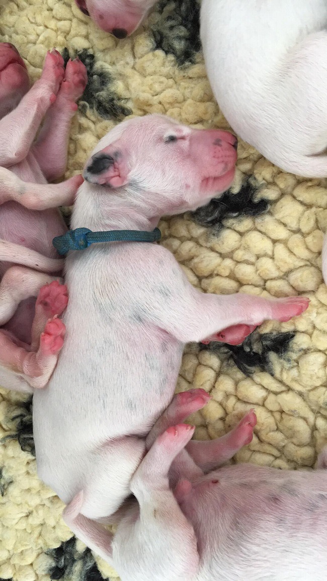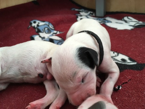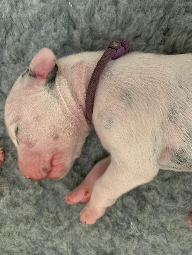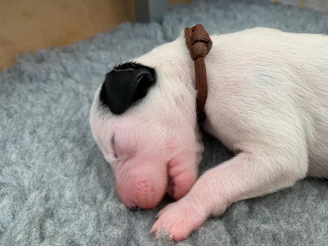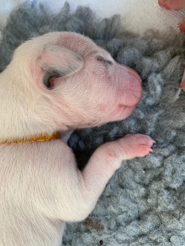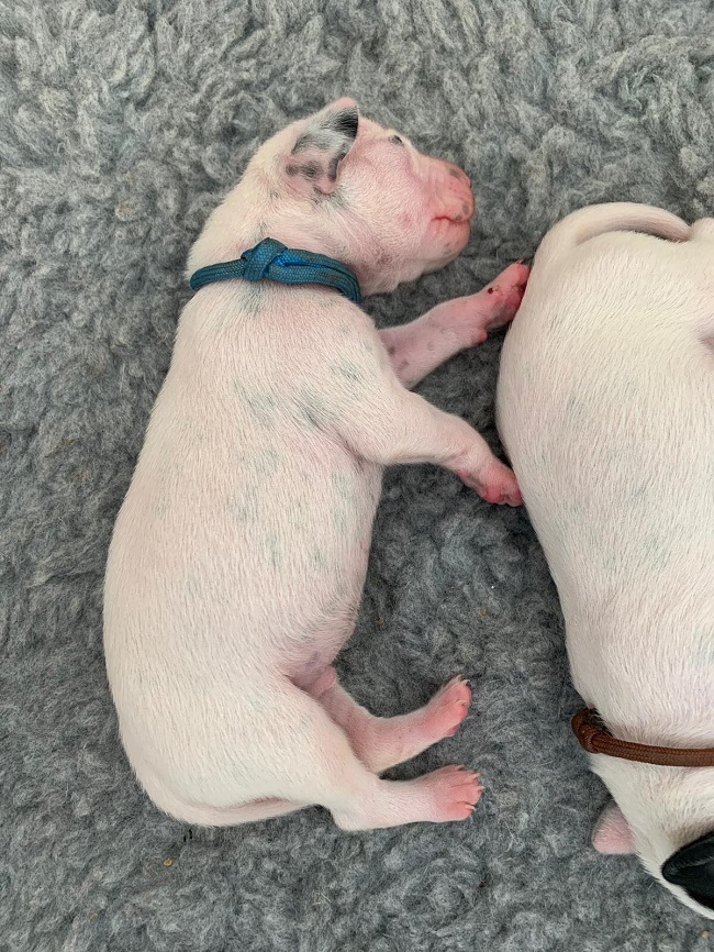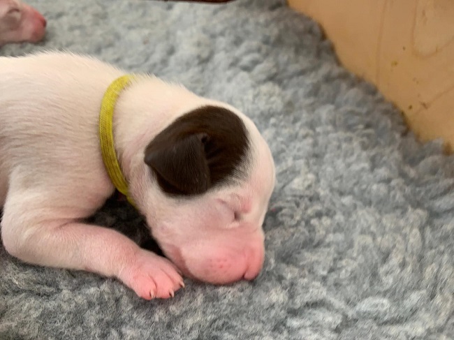 Die hübsche Frau Gelb, die erste w/b gefleckte Hündin mit Platte aus unserer Zucht!