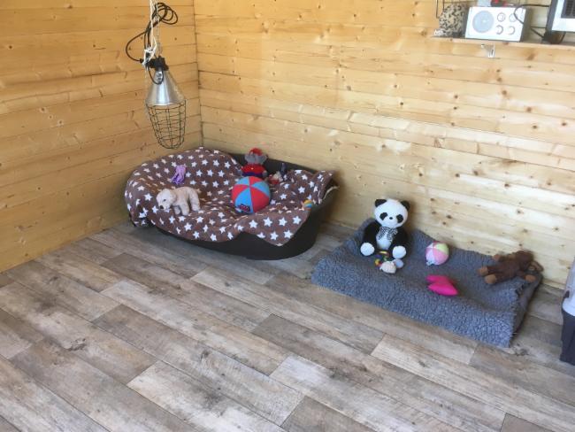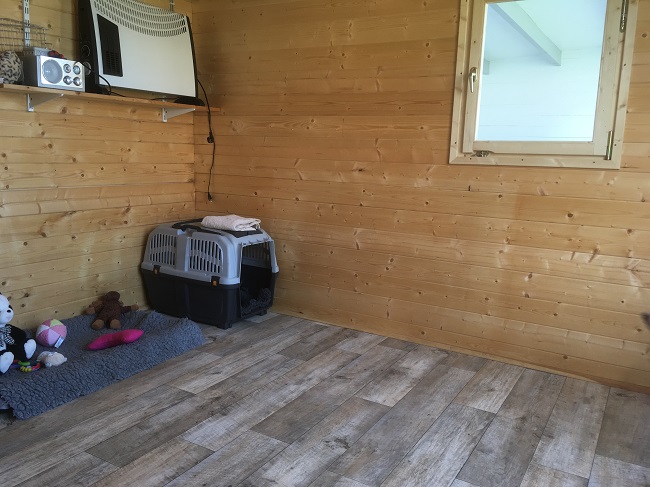 Die Innenansicht des Welpenhauses. Es gibt insgesamt 3 große Fenster die den Ganzen Tag über für genügend Lichteinfall sorgen! Außerdem natürlich genügend kuschelige Liegeplätze für Mama und Welpen, täglich wechselndes Spielzeug, ein Radio und natürlich eine Heizung.