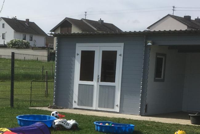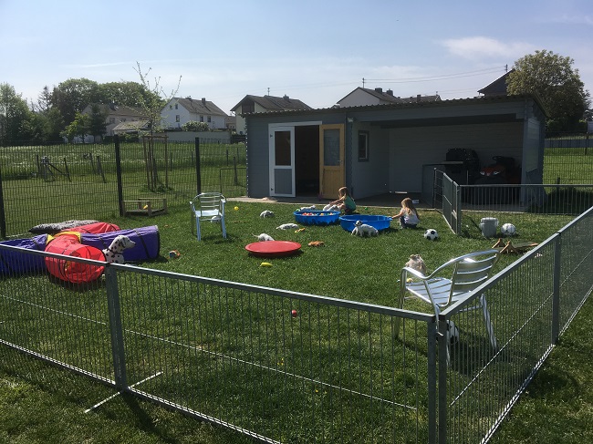 Das ist der Garten mit Welpenhaus in das die Welpen im Alter von ca. 4 Wochen umziehen. Hier gibt es genügend Platz ihrem Alter entsprechend die Umgebung zu erkunden. Wichtig ist mir das die Welpen sich schon früh an verschiedene Untergründe wie Holz, Stein, Gras und Sand gewöhnen.