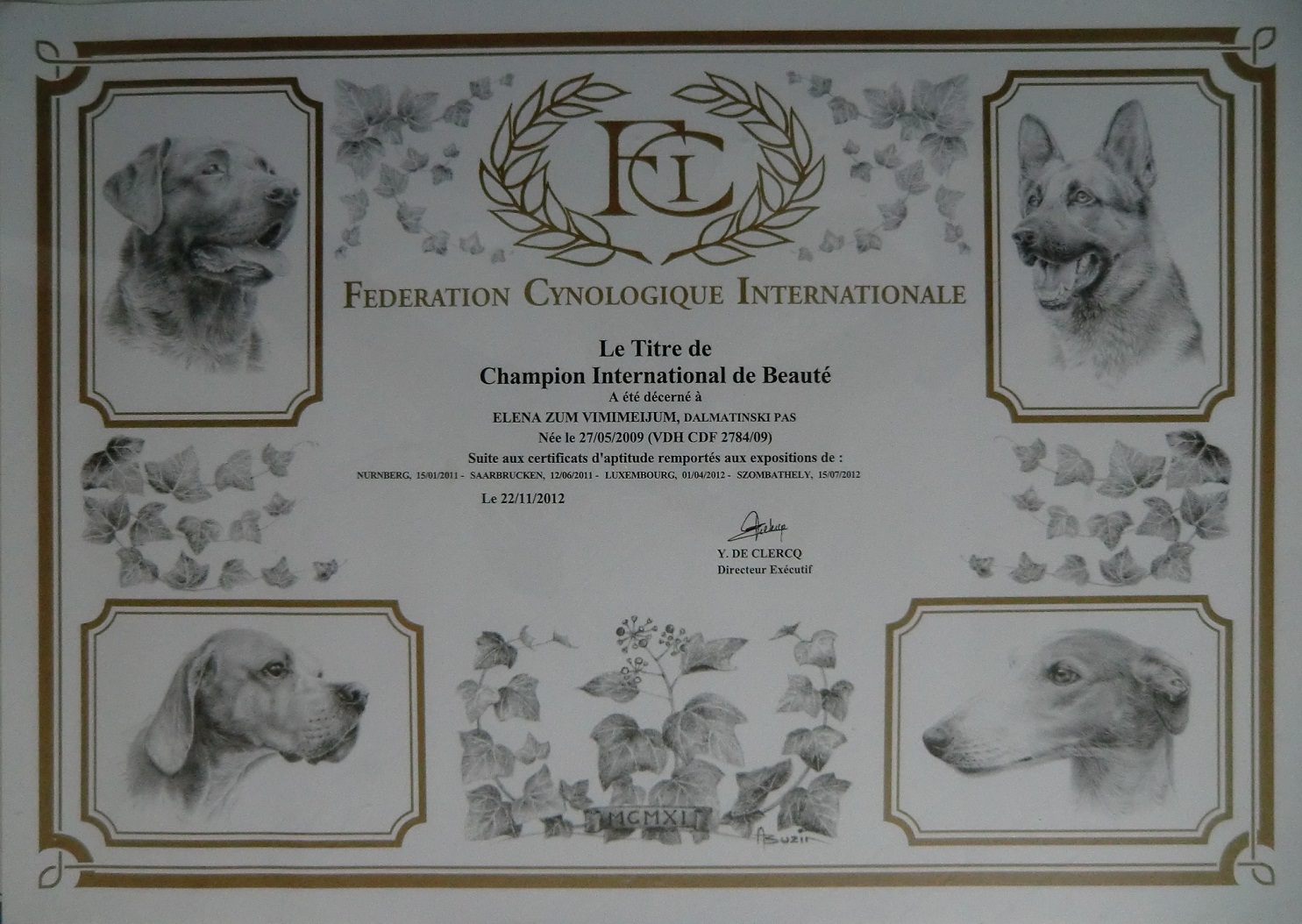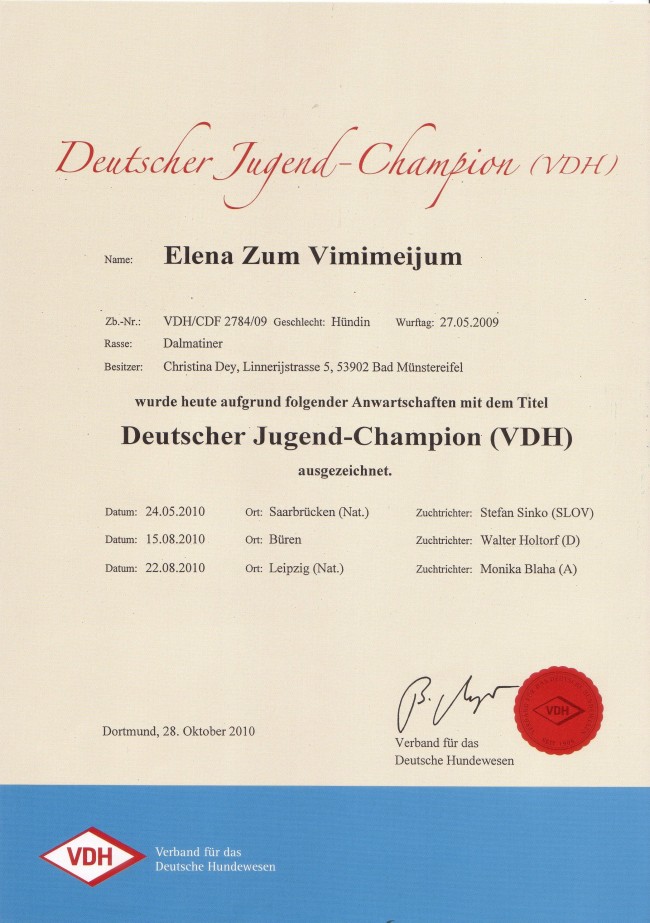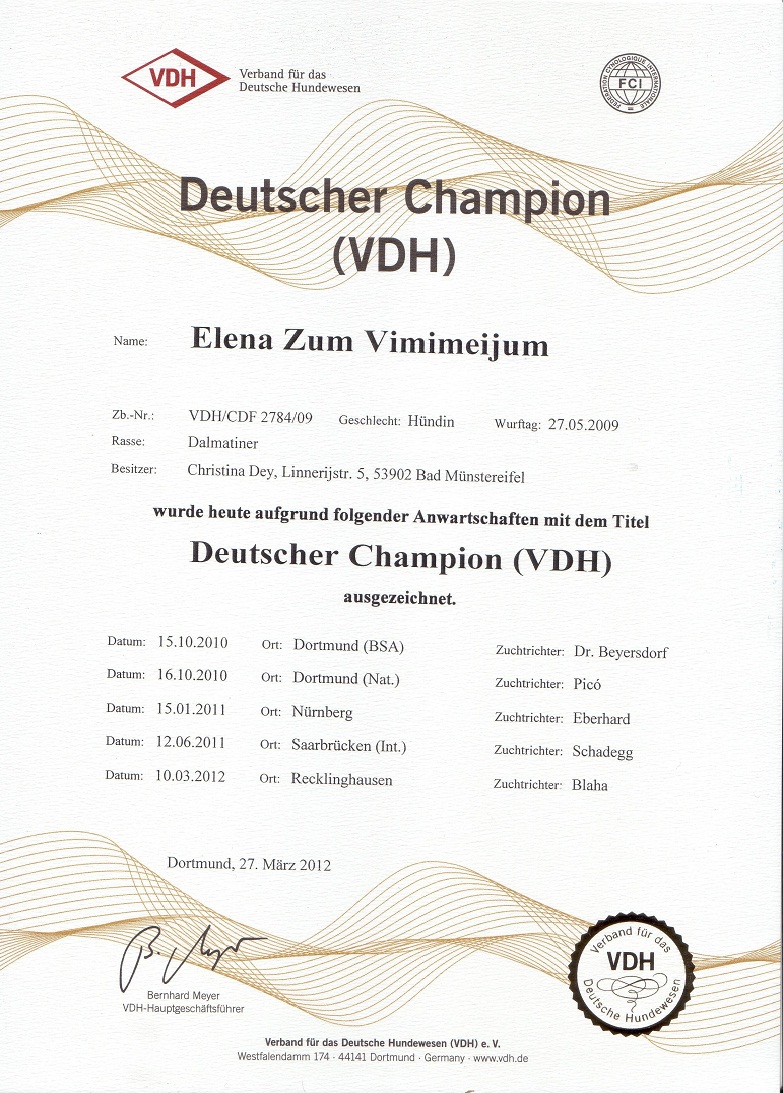 Ihr Ausstellungsdebüt hatte Elena am 06.12.09 auf der IRA Kassel, wo sie die stark besetzte Jüngstenklasse mit vv1 gewonnen hat. Mit gerade mal 11 Monaten wurde Elena Clubjugendsiegerin, Bester Junghund, Beste Hündin und gewann auch noch das BOB (bei 89 Meldungen) in Biebesheim! Mittlerweile hat sie schon viele weitere Titel, wie Deutscher Jugendchampion VDH & Club, VDH-Saar Jugendsiegerin Saarbrücken 2010 + (Beste Hündin + BOB + BIG2), Deutscher Champion VDH & Club vorzuweisen und steuert mit großen Schritten auf den Titel Internationaler Schönheitschampion zu. Erfolge auf Zuchtshows sind natürlich schön, und zeigt in gewisser Hinsicht welche Hunde in die Zucht gehören und zur Verbesserung und Erhaltung der Rasse beitragen, doch was mir am wichtigsten ist, ist natürlich das sie absolut gesund und munter ist!