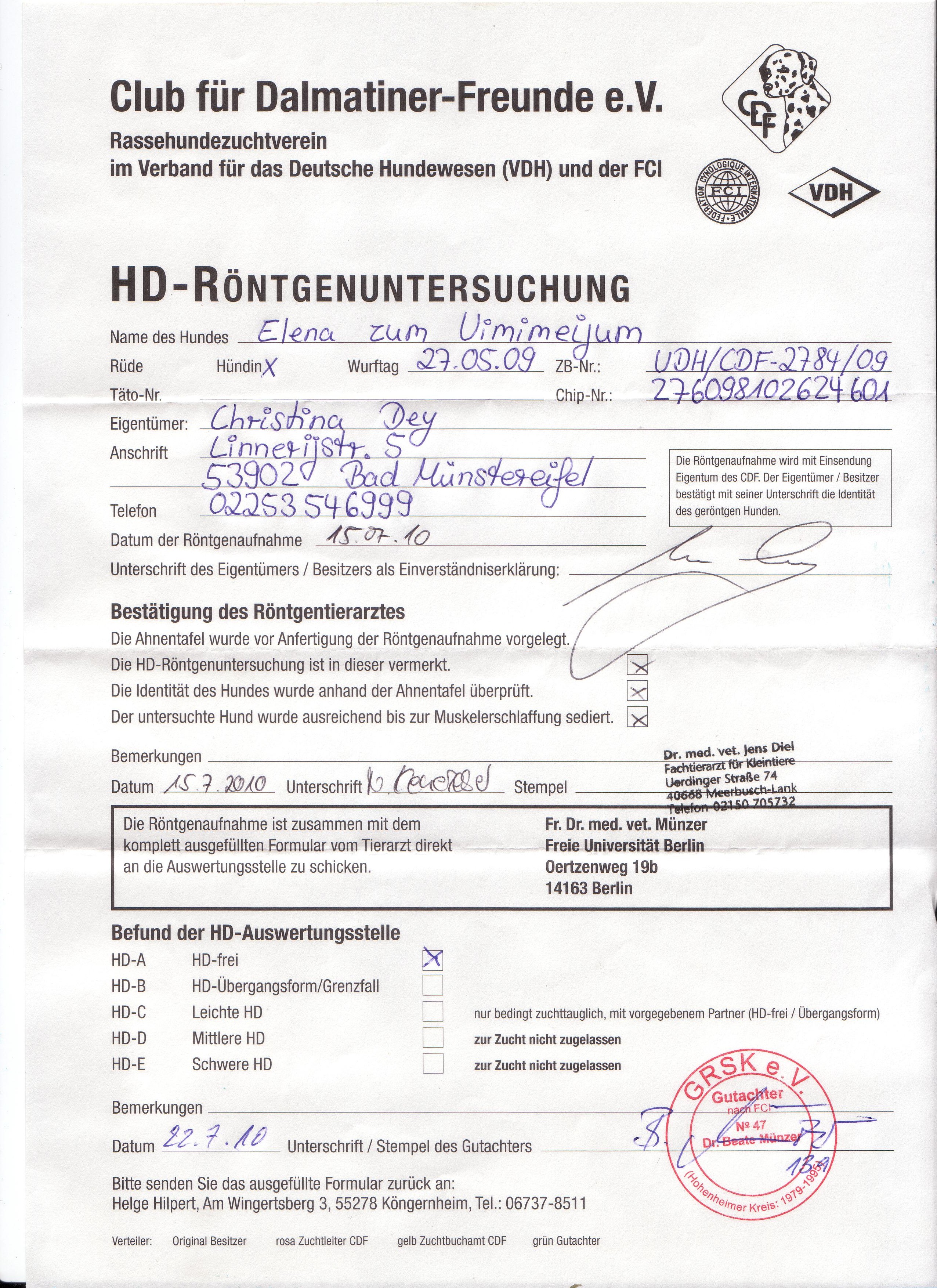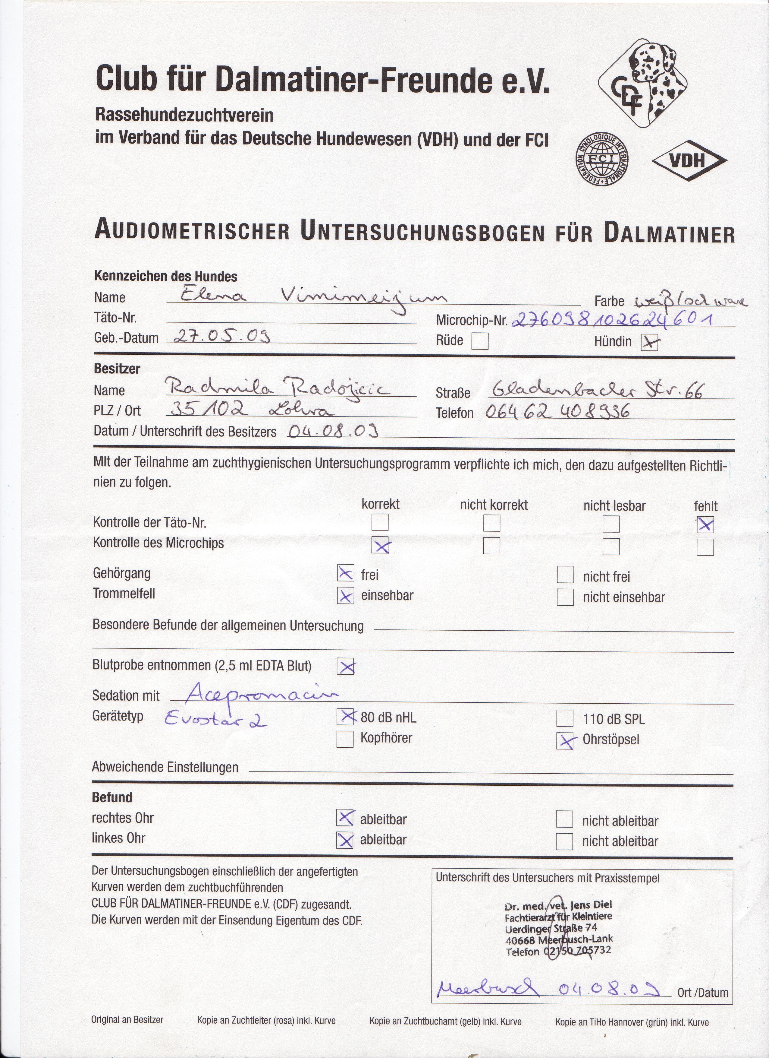 Elena wurde am 15.08.2010 in Büren von Herr Walter Holtorf ohne Auflagen/Empfehlungen zur Zucht zugelassen und erhielt in allen Prüfungsteilen immer eine Vorzügliche Bewertung.
