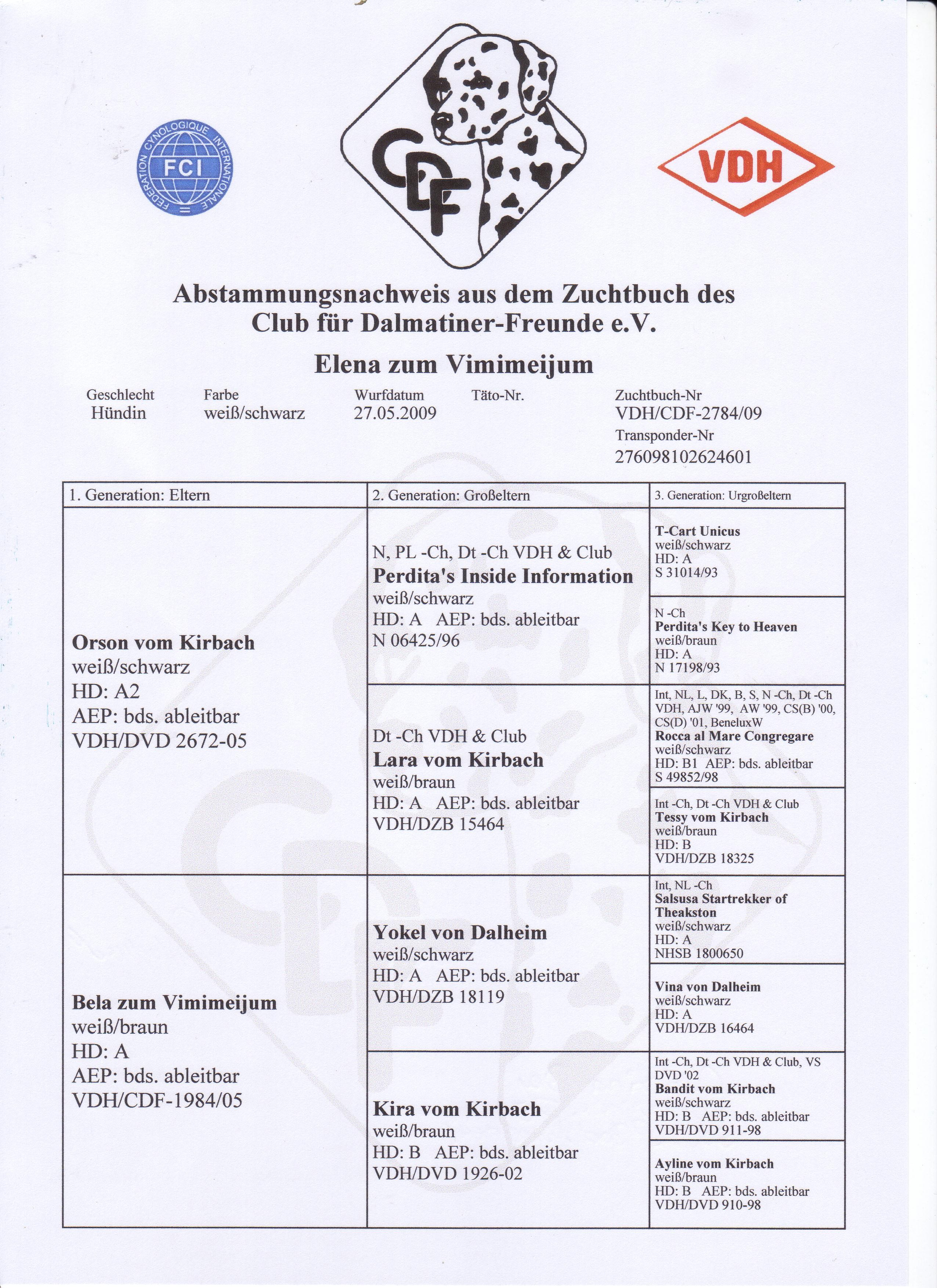 Elena basiert auf eine der erfolgreichsten Zuchtstätten in Deutschland: „vom Kirbach“. Sie stammt von besten erbgesunden Blutlinien ab. Unter anderem findet man in ihrem Pedigree Top Vererber wie Perdita’s Inside Information; Rocca al Mare Congregare; Salsusa Startrekker of Theakston; Lara vom Kirbach; Tessy vom Kirbach und Bandit vom Kirbach. Alle diese Bemerkenswerten Vererber haben einen besonders positiven Einfluss auf die Deutsche Dalmatiner Population genommen.