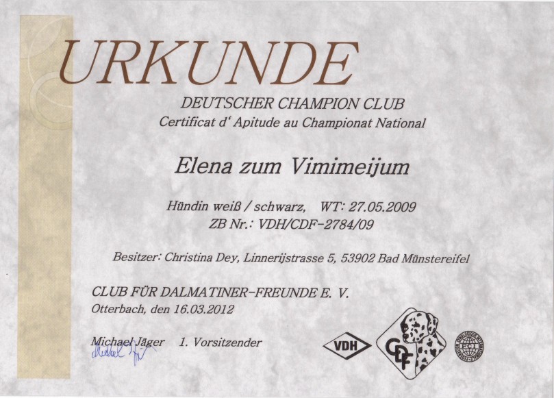 Mit Elena habe ich mir einen ganz besonderen Traum von einem Dalmatiner erfüllt, die alles für einen bestmöglichen Start in die Zucht mitbringt. War es doch mehr Zufall und ein ganz besonderer Glücksgriff das die kleine Maus noch zu haben war! Elena soll die Stammhündin meiner Zucht „Von der Bad Münstereifeler Höhe“ werden, und ich Danke Ihrer Züchterin Radmila Radojicic ganz herzlich das sie mir die kleine anvertraut hat!