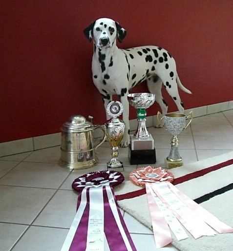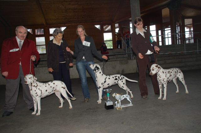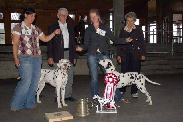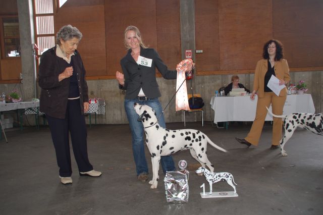 Alinas Richterbericht: 3 years, nice proportions of body and head, correct size, clean neck, very good firm topline, well layed down chest, well angulated behind, complet and correct denture, very, very good mover, very nice bitch, the judgement is spoiled by her overspotting